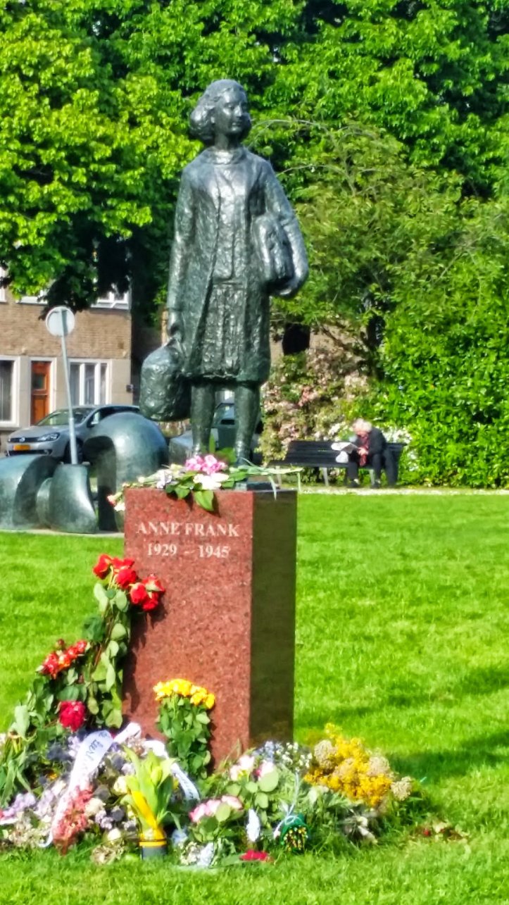 L’omission vient d’être réparée. Soixante-trois ans, jour pour jour, après le départ involontaire des Frank, au bout d’interminables discussions et tergiversations, et grâce à l’obstination d’un libraire local, le square Merwede a son monument : une belle sculpture d’Anne Frank, de la main de la sculptrice Jet Schepp, au moment du départ vers la cachette, munie de sa valise et d’autant de vêtements qu’elle pouvait porter les uns par-dessus les autres, jetant un dernier regard en arrière. La cérémonie fut sobre. Peu de discours – une amie, témoin de l’époque ; deux jeunes, l’un musulman, l’autre juif, lisant chacun l’histoire de l’autre ; le bourgmestre de la ville insistant tous sur le danger de toute discrimination, quel que soit le groupe visé et d’où qu’elle vienne. Un public attentif. ‘Enfin, les déportés du quartier ont leur monument’, disait une femme, elle-même victime du nazisme. Le quartier l’a célébré, en dansant aux sons d’un orchestre klezmer. Quant à l’appartement de la famille Frank, il est devenu ‘Maison des écrivains’, un refuge pour écrivains et journalistes persécutés dans leur pays.