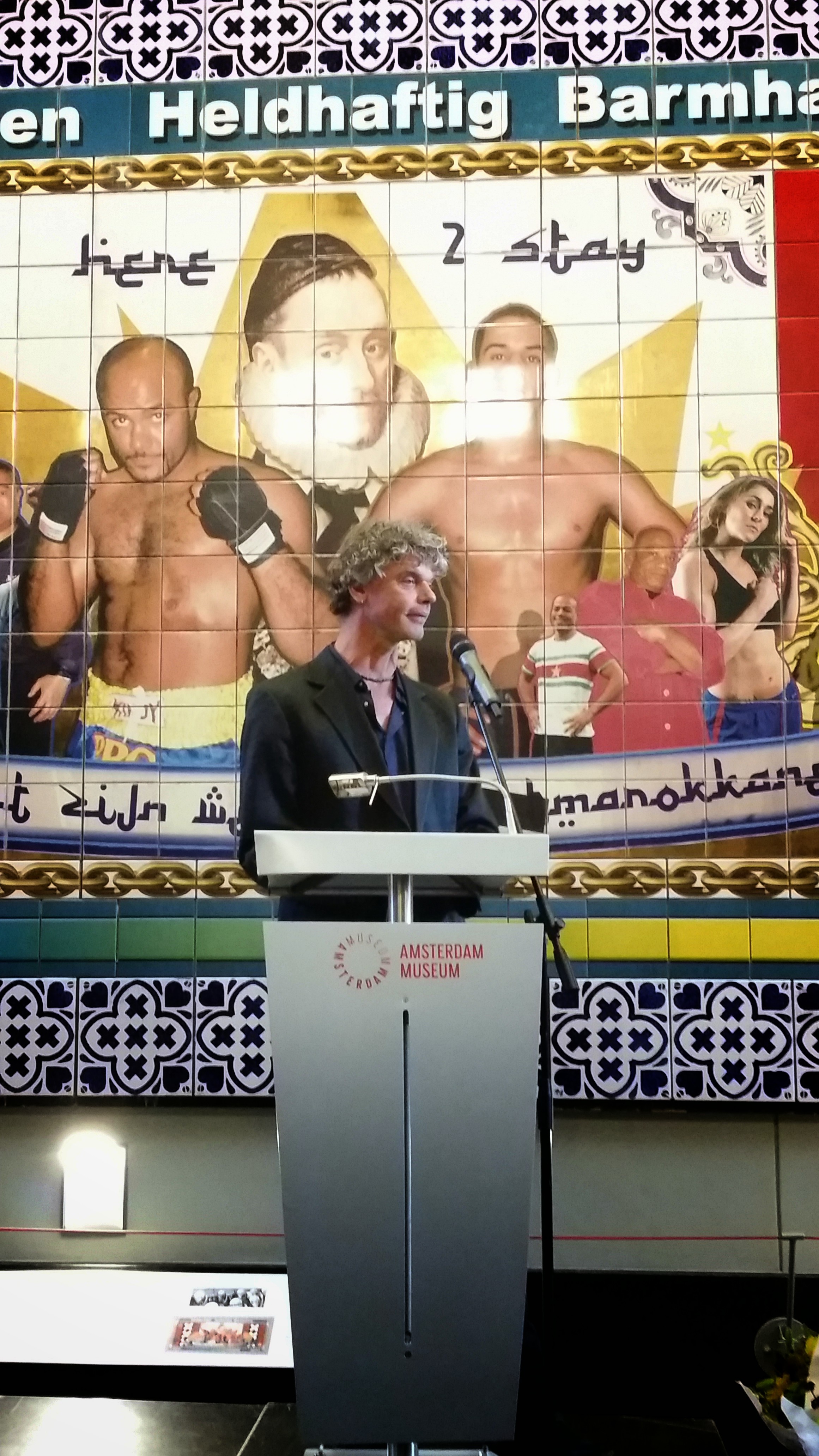 Au vernissage, c’est son pote, l’écrivain néerlando-marocain Abdelkader Benali qui le