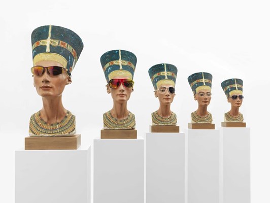 conceptuel, abstrait, figuratif, ou quoi ? En fait, elle fait de tout, ou un mélange des genres. Elle utilise toutes sortes de matériaux, toutes les techniques – de la peinture jusqu’au film, en passant par la sculpture, la construction (ou ce qui y ressemble), les assemblages les plus divers. Elle repeint des hublots d’avion. Elle habille des mannequins, des poupées. Elle se met en scène dans une performance filmée. Elle assemble des blocs de béton. Elle dessine des nouvelles tours pour New York ou d’autres villes. Elle revêt un buste de Nefertiti de toutes sortes de lunettes de soleil : « Fais-toi belle…» Elle a même (lors d’un séjour à l’hôpital) fait faire des scans de son propre cerveau. Et j’en passe…