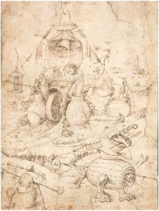 En tous cas, ses thèmes plaisaient, si effrayants qu’ils nous semblent aujourd’hui. Bosch était célèbre, cela est une certitude, ses œuvres se vendaient bien (et à des acheteurs haut placés). Un de ceux-là était Philippe le Bel, duc de Bourgogne, qui lui acheta au moins deux œuvres, un triptyque sur le thème de « La tentation de Saint-Antoine » (que Philippe a offert à son père, l’empereur Maximilien d’Autriche), et un « Jugement dernier ». Vu le succès que Bosch avait déjà de son vivant, ses œuvres se sont dispersées aux quatre coins de l’Empire – et si actuellement, on n’a identifié que 24 ou 25 peintures (selon les écoles…) et à peu près autant de dessins, beaucoup d’œuvres ont dû disparaître. Parmi celles qui restent, un certain nombre se sont retrouvées, par voie d’héritage, aux mains du Roi Philippe II d’Espagne, et donc à l’Escurial et au Prado. Certaines ont pu être achetées, pas des musées (et aussi par quelques rares collectionneurs privés). Aucune, en tout cas, n’est resté à Bois-le-Duc…