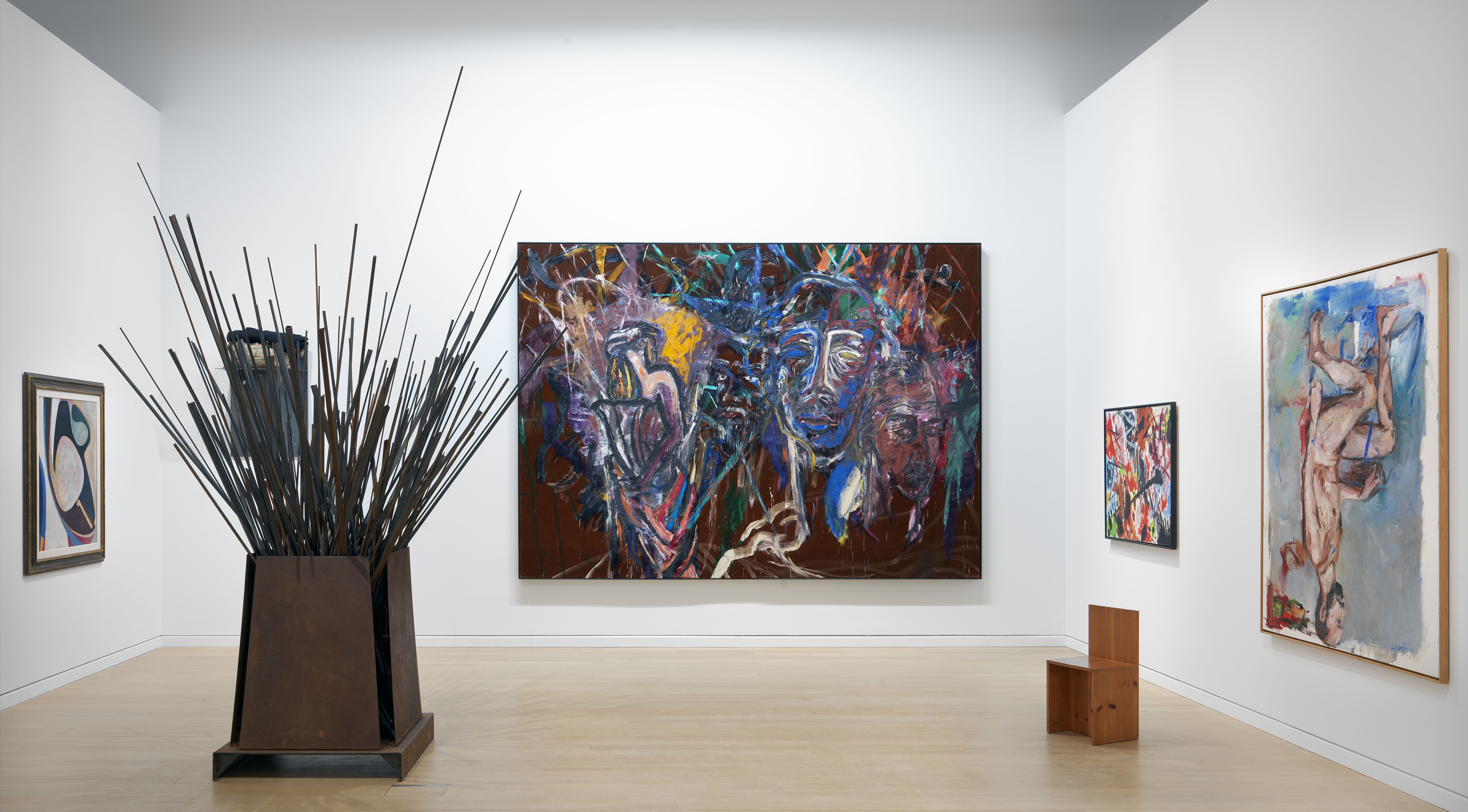 Pourquoi avoir combiné ce « Nu » (1994), exubérant et haut en couleurs, de Karel Appel avec « La muse vénale » (1979) de René Daniëls, qui pâlit à côté ? Et avec « La jeune fille au taureau » (non daté) de Maria Lassnig ? Pourquoi cette inquiétante « Carrousel » (1988) à animaux suspendus de Bruce Nauman devant ces deux Gilbert & George, somme toute assez paisibles ?