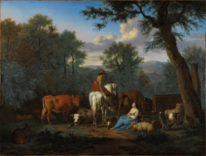 A l’époque, les peintres ne dépendaient plus, pour vivre, de quelques grands commanditaires, comme l’Église ou les princes. Ils devaient chercher à se maintenir dans un marché relativement étroit, où la concurrence était grande. Ils avaient donc intérêt à se spécialiser : un tel faisait surtout des portraits, tel autre des scènes rurales, tel autre encore des animaux. Pour Adriaen, son spécialisme, c’était donc surtout les paysages de toutes sortes, que ce soient des scènes rurales semblables à celles de Paulus Potter, ou bien des paysages romantiques, ‘italianisants’, ou bien encore des scènes de chasse ou des paysages de bord de mer. Et cela marchait, il avait du succès et même longtemps après sa mort, ses œuvres restaient très prisées.