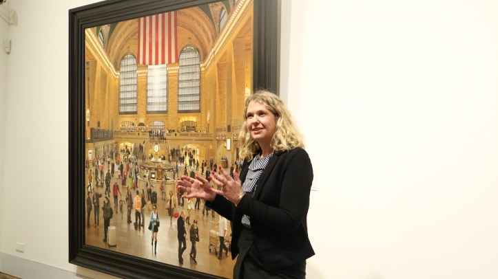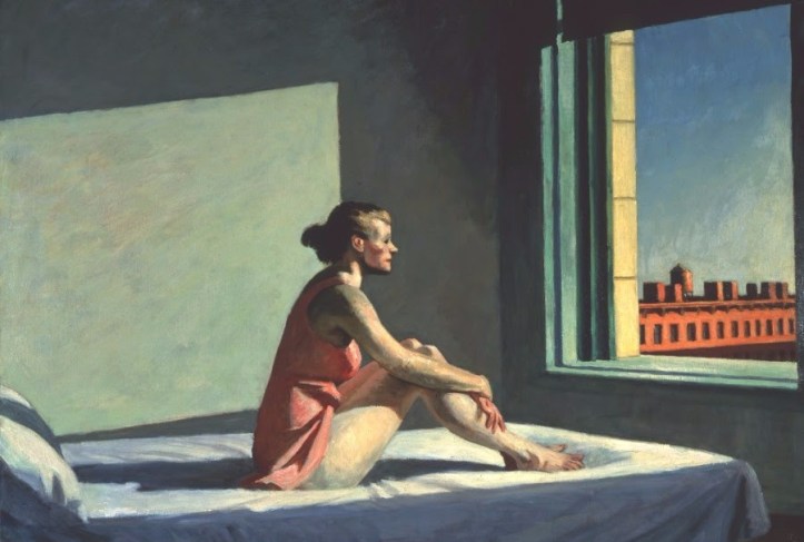 A Emden, l’exposition reprend à partir de 1966, là où à Assen elle s’arrête. Ici, changement de cadre. Rigueur allemande. Pas de scénographie ingénieuse, des salles austères aux murs blancs où les tableaux, souvent immenses ‑ et parfois tout petits ‑ sont accrochés tout simplement. Et pourtant, cela « marche », ou plutôt, c’est le spectateur qui « marche ». Encore des Hopper, plus récents qu’à Assen, mais aussi touchants. Comment fait-il, cet artiste, pour nous toucher si profondément par des scènes apparemment si simples ? Une femme en train de coudre, un couple dans un restaurant… On imagine toute une histoire derrière, on voudrait s’y attarder, encore et encore. Mais il faut s’en arracher, il y a d’autres tableaux, aussi fascinants, la Gare Centrale de New York de Stone Roberts (voir ci-dessus) où l’on pourrait passer des heures, tellement il y a de choses à voir. Des baigneurs au bord de l’eau, un « diner » presque photographique, des scènes de rue, de la vie courante. Des œuvres comportant un message politique aussi. Deux cents œuvres au total, un trésor. Dont vous sortirez heureux. Enfin, moi, j’en suis sortie heureuse. Tant de beauté…