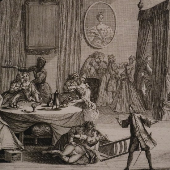 Laquelle expo ne se contente d’ailleurs pas de montrer « le côté cour » de ce beau monde. Il y a aussi un côté moins glorieux : celui de tous les vices attribués aux grands de ce monde, à en juger par les caricatures répandues au XVIIe siècle et après. On y voit des gens de « la haute » qui s’empiffrent, se saoulent, s’étourdissent à fumer du tabac (ou de l’opium, sait-on jamais), reluquent les dames (ou leurs images…), fréquentent des prostituées, se livrent à des ébats illicites, se montrent envieux du voisin… etcetera, etcetera…