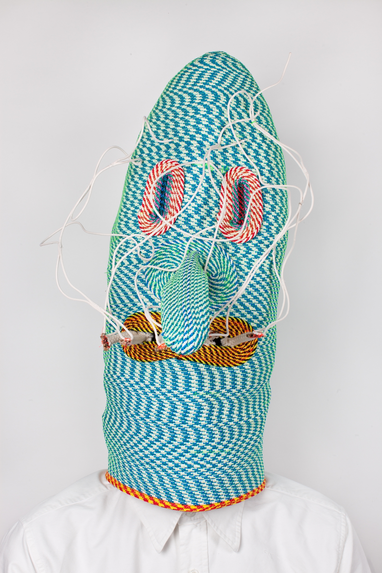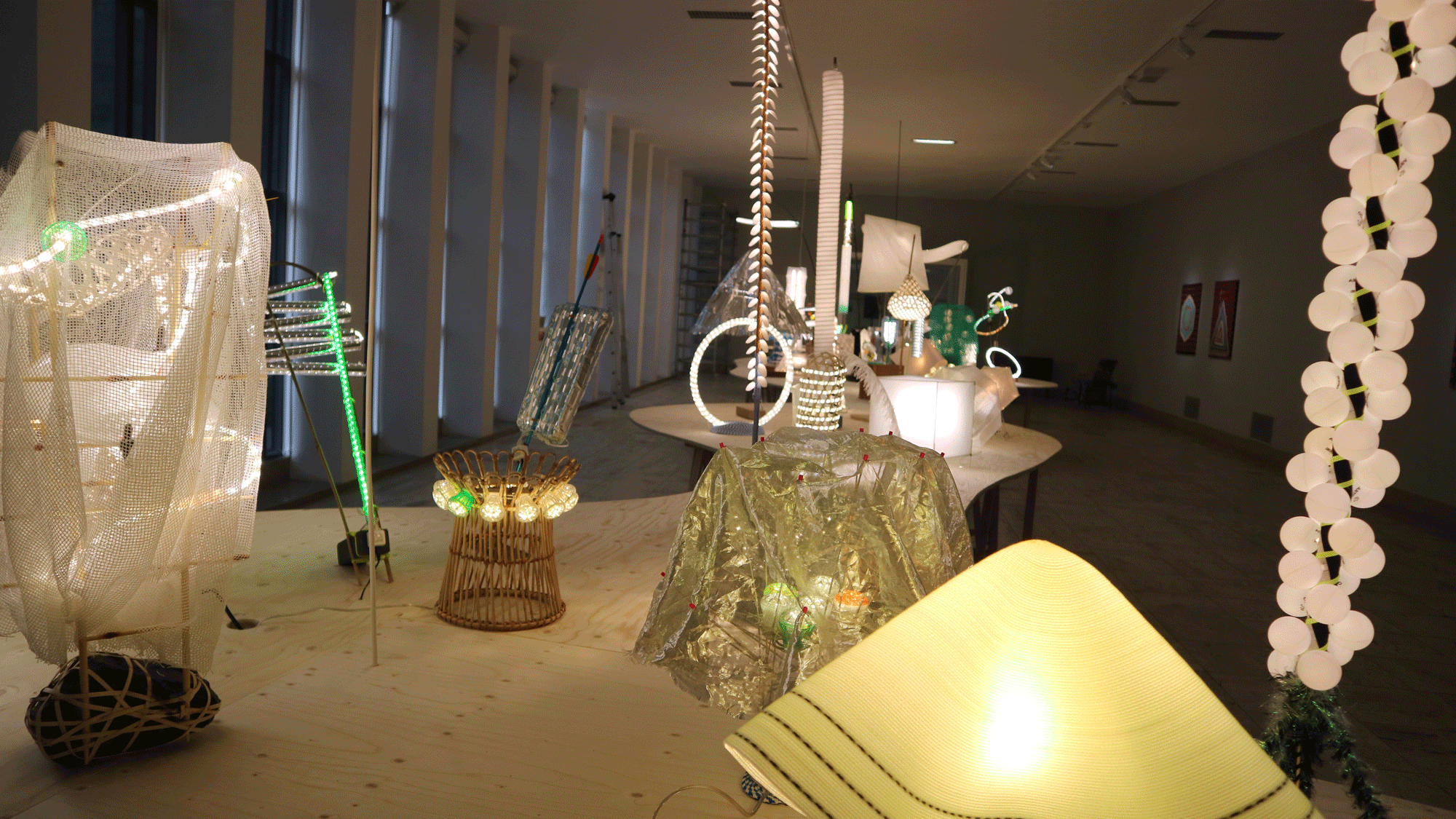 Ce créateur prolixe et multiforme « fabrique » aussi des tableaux et des masques à partir de cordes qu’il coud à la machine, se laissant inspirer par les (combinaisons de) couleurs et les formes qui se produisent sous ses mains, tant soit peu « spontanément ». Parfois, ça tient de l’art optique à la Vasarély, parfois de l’artisanat pur et simple. Ainsi, des paravents/rideaux tissés de bandes d’étoffe divisent un grand espace où quelques chaises longues sont recouvertes de la même manière. C’est joli, cela intrigue et cela a sûrement un usage pratique.