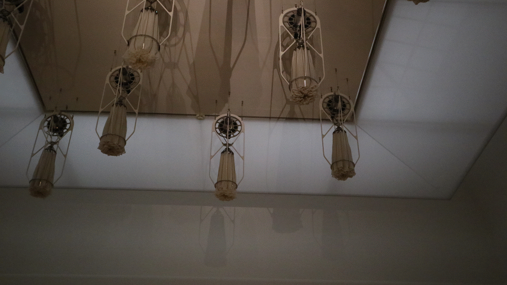 Une chose que j’ai aimée, qui m’a touchée, c’est Sensory Spaces 14 de Latifa Echakhch. Elle est française d’origine marocaine, mais elle vit en Suisse. Elle est jeune (1974), elle a l’air timide et fragile, mais attention : elle s’est déjà fait un nom dans le monde des arts, avec plusieurs expositions à son nom, en Suisse comme en France. Ce qu’elle a fait ici ? A première vue, elle a simplement peint sur le sol de gros traits noirs, irréguliers, qui vont d’un mur à l’autre en suivant un tracé assez capricieux. A y regarder de près, ce n’est pas si simple. Au bout de chaque tracé, un vêtement noir est suspendu au mur. C’est avec ces vêtements qu’elle a fait ces tracés, qui du coup apparaissent comme des dégoulinades. Aussitôt, on associe l’encre avec le sang, et l’ensemble prend un aspect sinistre. Mais en même temps, le visiteur est invité à entrer dans l’œuvre d’art, à se déplacer à travers les tracés comme dans un labyrinthe. Et à partir de là, l’œuvre prend comme une troisième dimension. Voilà « l’espace sensorielle », quoi. C’est drôlement sioux.