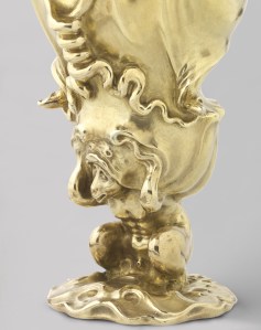 Ne vous étonnez donc pas que le XVIIe siècle ait connu, lui aussi, ses « designers » ou « stylistes », en tout cas des artisans qui faisaient de certains objets utilitaires de véritables créations artistiques. Et certains d’entre eux ont eu un tel succès, que le monde entier achetaient leurs produits ou les copiaient. Deux de ces artisans-artistes étaient les frères Paulus (±1570 ‑ 1613) et Adam Van Vianen (±1568 ‑ 1622), tous deux orfèvres, tous deux célèbres en leur temps. Paulus, le cadet, a quitté très jeune leur ville natale d’Utrecht. Au bout de longues pérégrinations à travers la France et la Bavière, il s’établit à Prague, où il devient « Kammergoldschmied » (orfèvre personnel) à la cour de l’empereur Rodolphe II. Le souverain lui laisse toute liberté artistique, mieux : il semble même avoir stimulé l’imagination débordante de son artisan artiste, qui mène vers ce qu’on a fini par appeler le style auriculaire (ou lobé ou lobaire) ‑ faute d’un meilleur terme. L’appellation vient d’une certaine ressemblance des éléments décoratifs avec la forme (du lobe) de l’oreille. Ce sont des ornements qui vont littéralement dans tous les sens. Certains éléments sont reconnaissables, comme le Jugement de Paris sur le dessus d’une coupe en argent (1607). Mais le pied de cette même coupe est orné de végétaux fantaisistes aux formes capricieuses. Et partout, des lianes (des vignes ?), des feuilles lobées, des formes ressemblant vaguement à des coquilles ‑ ou au lobe d’une oreille….