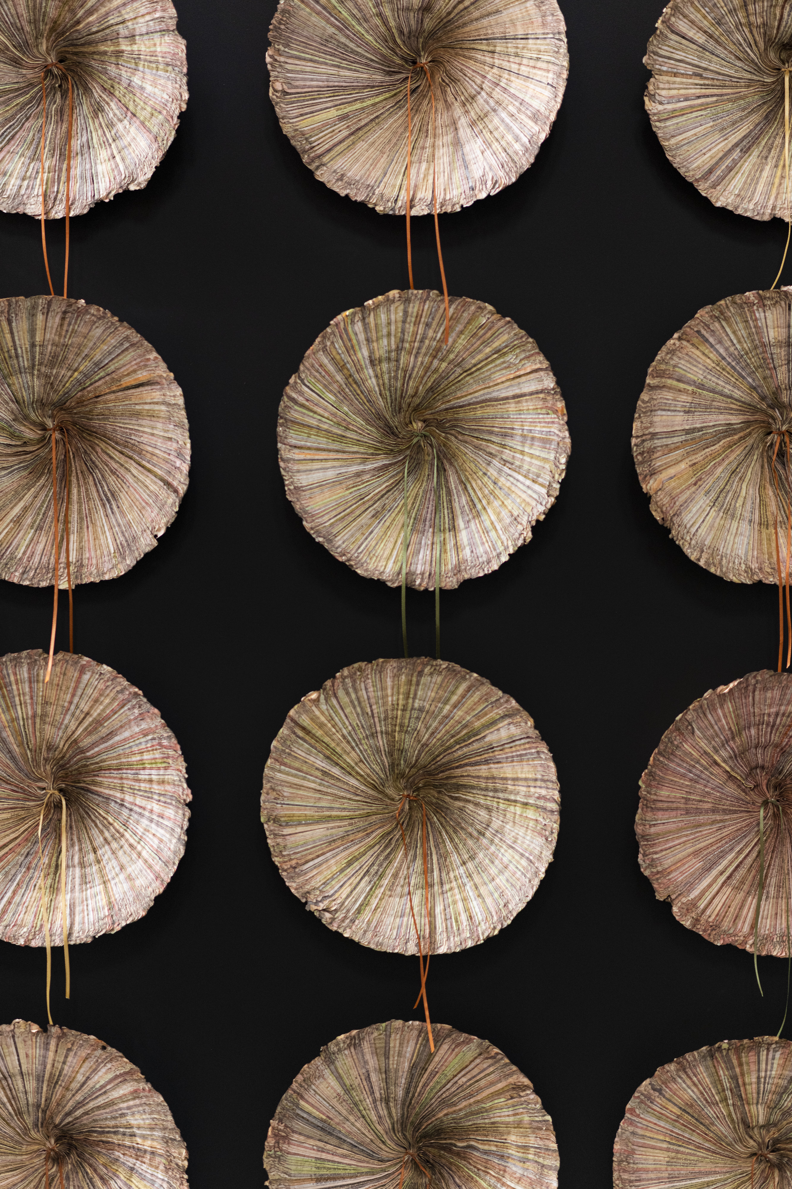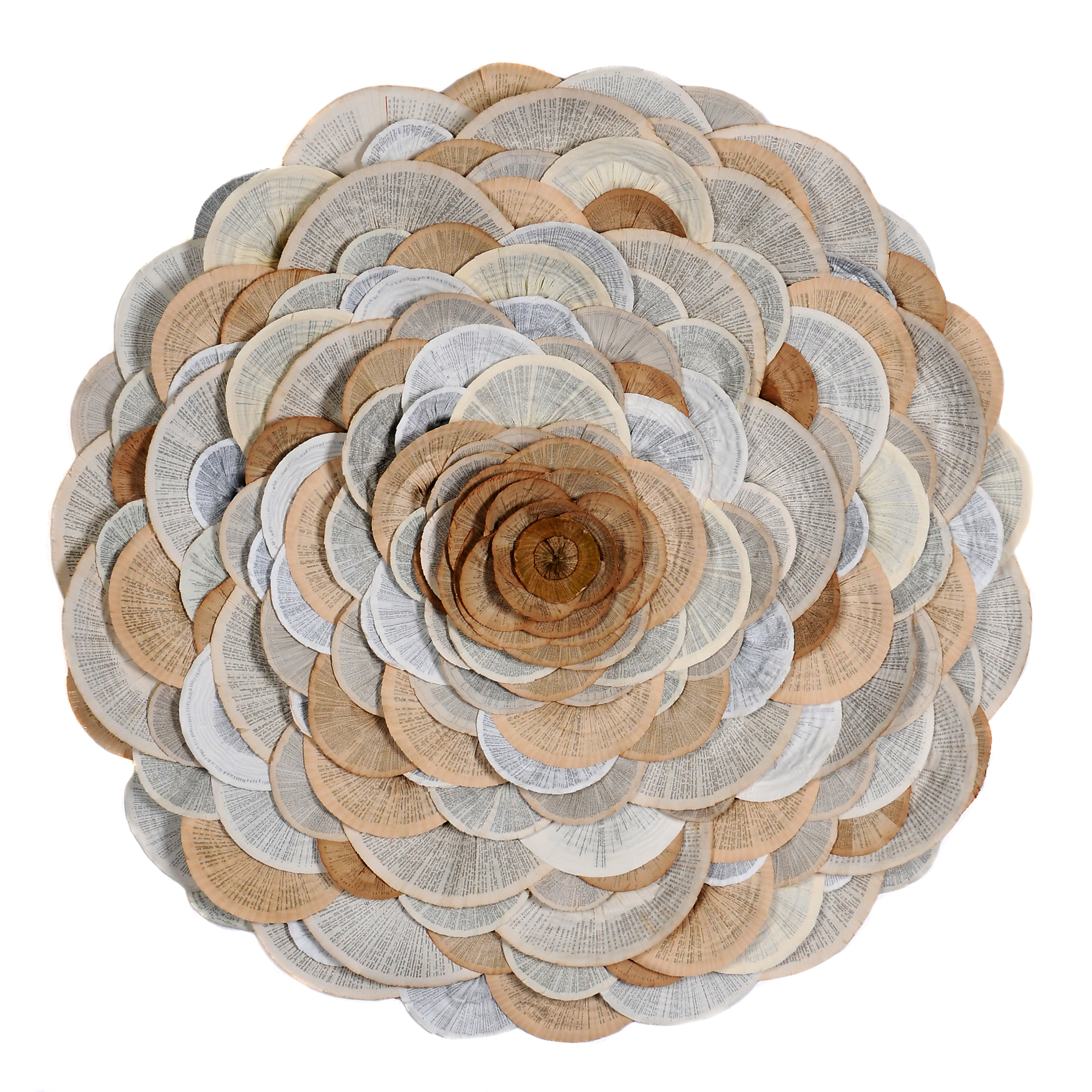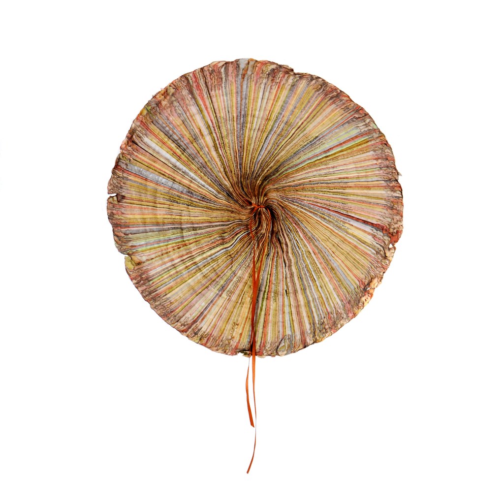 Et ces œuvres sont pleines d’intérêt, elles intriguent, elles semblent poser des questions plus qu’elles ne donnent de réponses. Et elles sont étonnantes, ne serait-ce que par le matériau utilisé : du papier. En l’occurrence, du papier bible, provenant de vraies bibles mises au rebut pour une raison ou une autre. Pour certaines œuvres, Annita Smit à pris du papier provenant de vieux livres de cantiques, plus épais que le papier bible. Dans certains cas, elle a teint ou peint le papier (à l’encre ou à la peinture acrylique), dans d’autres, elle a joué des textes imprimés et du blanc bordant les pages pour obtenir un dessin. Et partout, il faut y regarder à deux fois pour voir que c’est effectivement du papier…. tellement il a été travaillé, trituré, modelé. Annita Smit commence par le tremper dans l’eau, ensuite elle le plie de différentes manières, le forme et le reforme, puis une idée se crée ,« et ensuite, dit-elle, commence un travail de moine. » Petit à petit, elle construit ainsi ses oeuvres, des tableaux, ou bien des objets, des sculptures, pourrait-on dire.