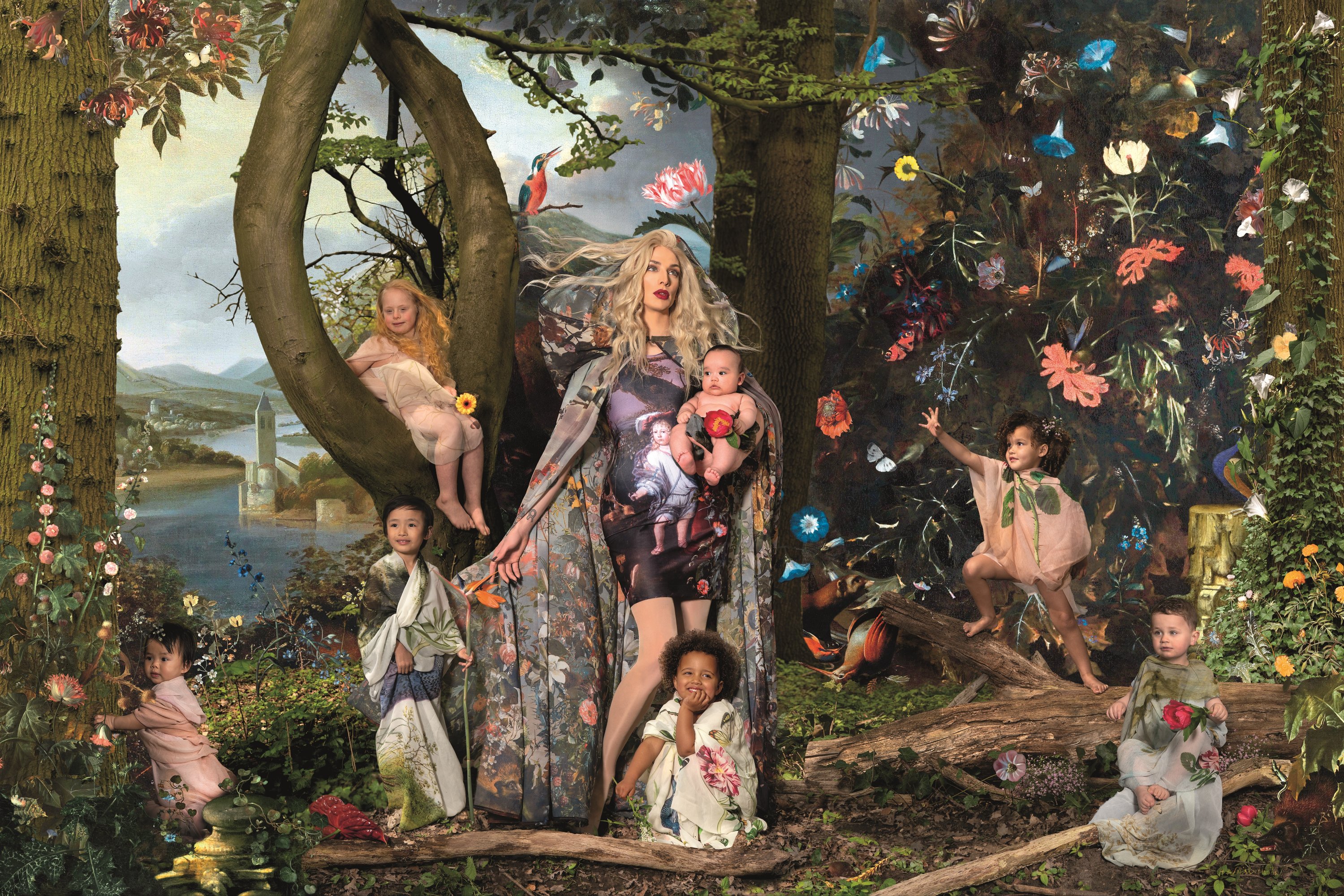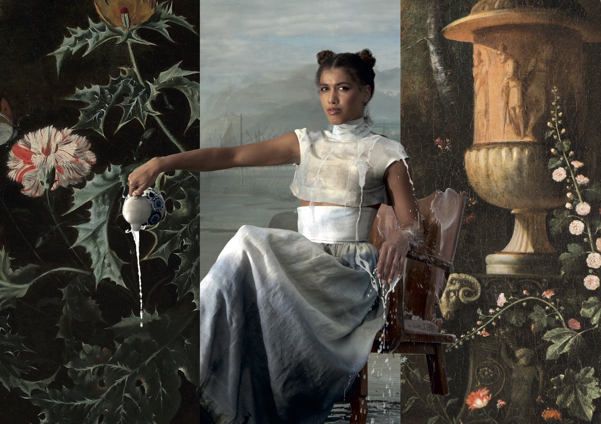 Ces photos – ou plutôt ces tableaux, il mélange plusieurs techniques – sont des mises en scène minutieuses, avec de multiples détails empruntés à Matthias (et certains à Alida et à Pieter, sa fille et son fils). On retrouve ces détails jusque dans les tissus des robes portées par les modèles – tissus que Hans a spécialement fait fabriquer. Les robes elles-mêmes sont exposées aussi d’ailleurs, et on peut constater qu’au toucher elles font aussi ‘féeriques’ que dans les photos.