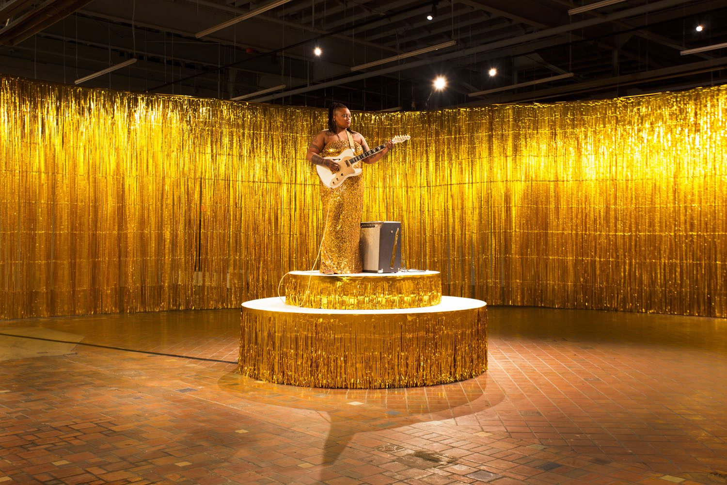 Entrant dans le musée, vous entendez un son. Un accord de guitare en mi mineur. Il se répète. Et encore. Et encore. Vous vous rapprochez, vous voyez une clôture dorée, un rideau consistant en une multitude de lanières – dorées – qui enferment un espace rond. Et là, au milieu, une femme, en robe dorée, se tient sur un piédestal qui tourne. À intervalles réguliers, elle frappe cet accord en mi mineur. Au bout d’un moment, une autre femme, toujours en robe dorée, prend la relève. Et joue ce même accord. Et ainsi de suite…