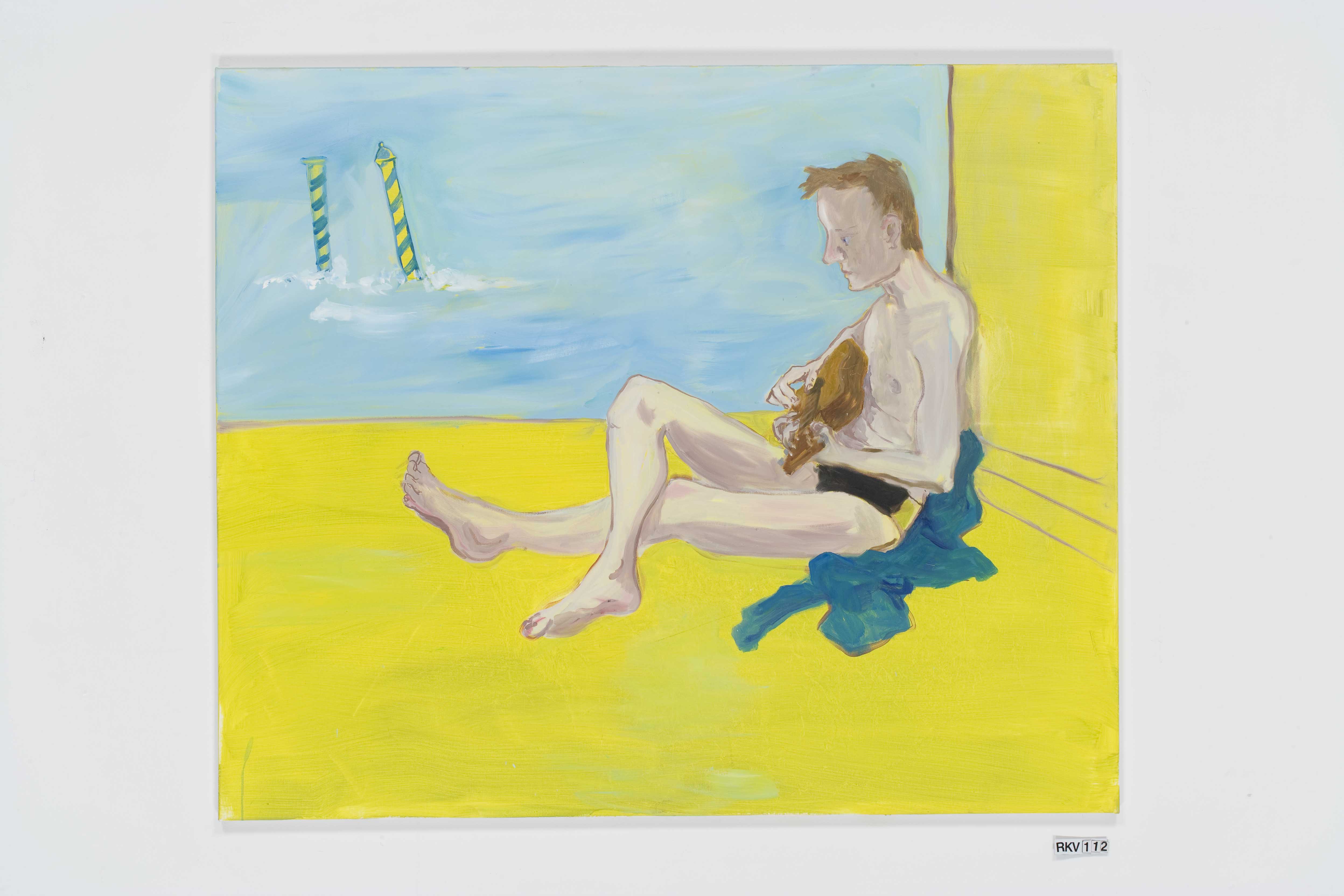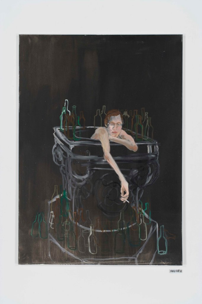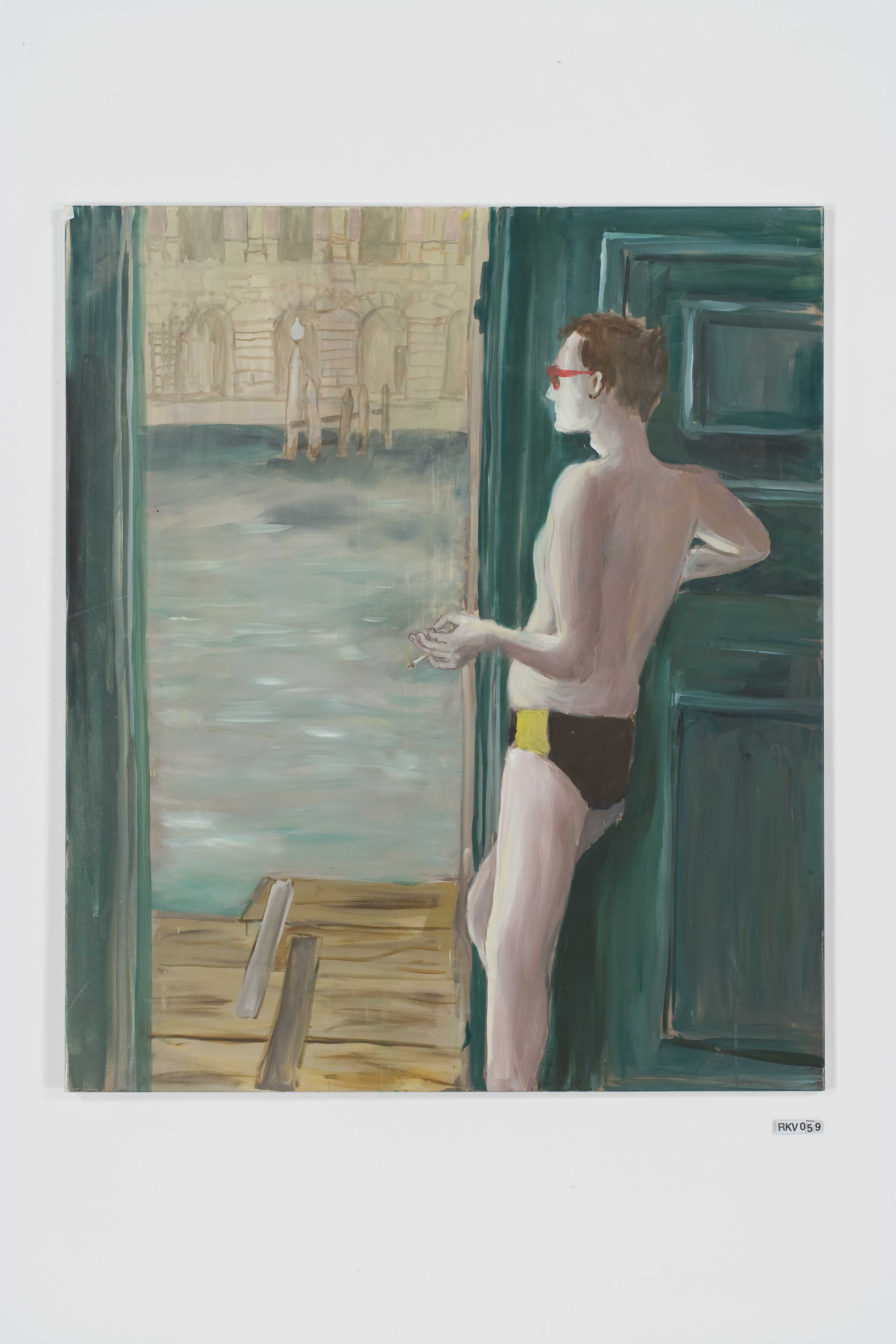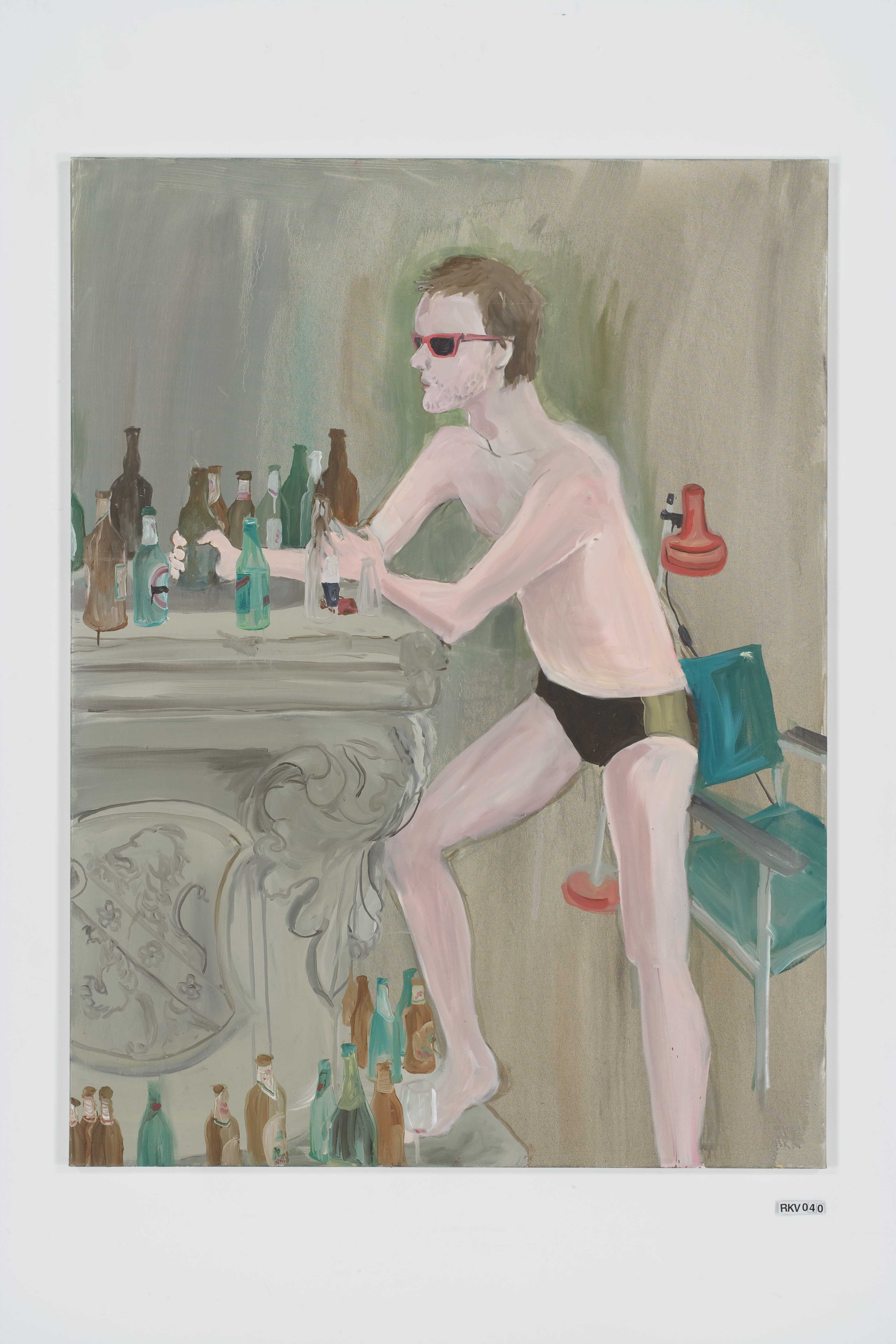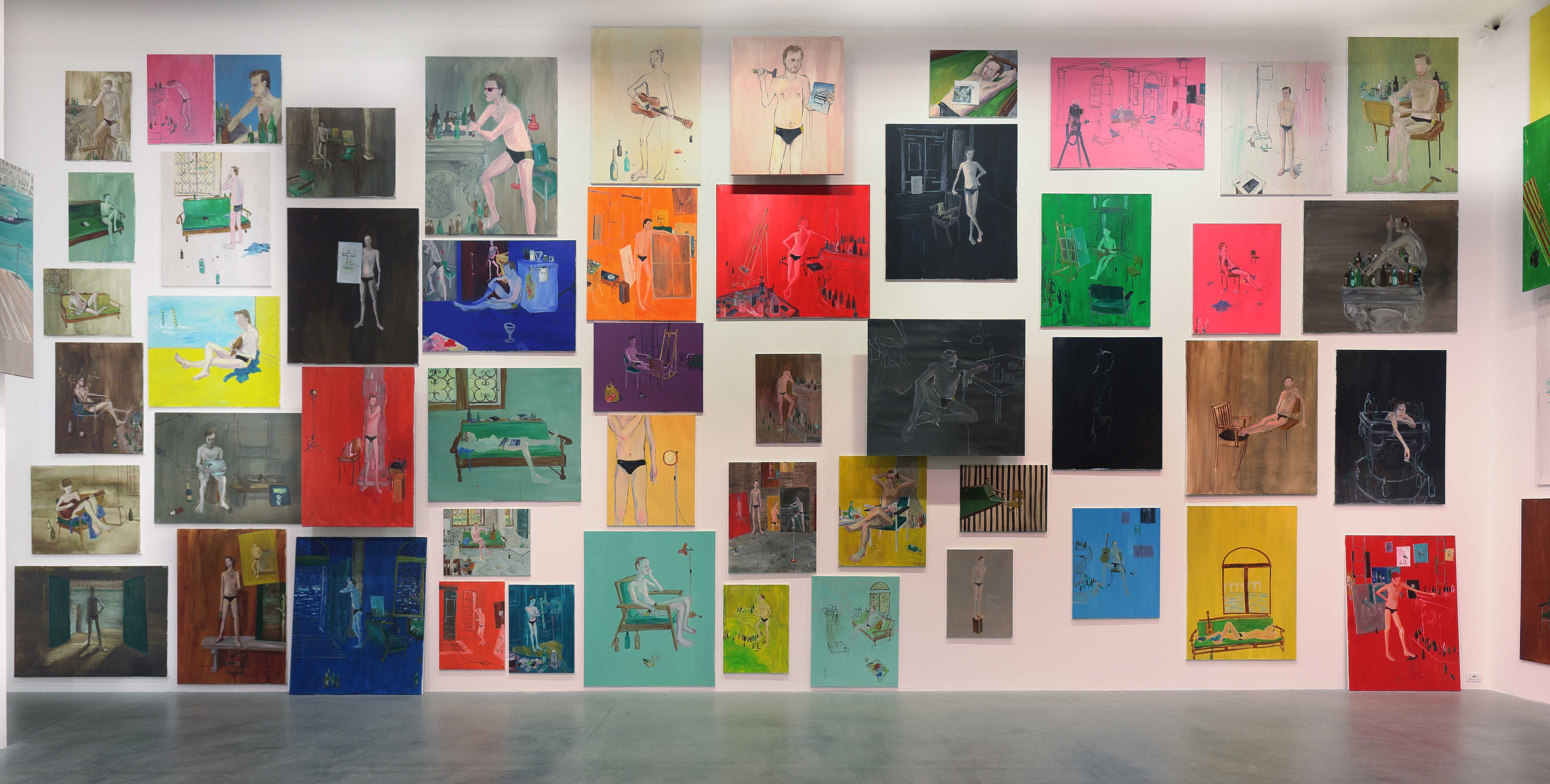 Another series of paintings, exhibited at the Venice Biennale (2009), shows the same male model in the same swimming outfit in the same room during five months… We see the temperature getting hotter and hotter, the model more and more bored and worn out, drinking and smoking more and more, until at the very end the empty bottles and full ashtrays all but fill the room.