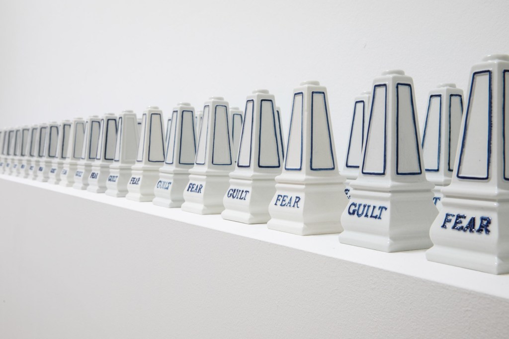 Dans les petites pièces qui longent la grande salle (les « cabinets à laine », où autrefois on travaillait la laine) vous voyez des rangées d’objets en céramique, qui ont la forme de salières ou de poivrières – tous semblables, tous portant une inscription : fear (crainte) ou guilt (culpabilité). Fear – guilt – fear – guilt – fear – guilt, répété quasiment à l’infini… À vous d’interpréter…