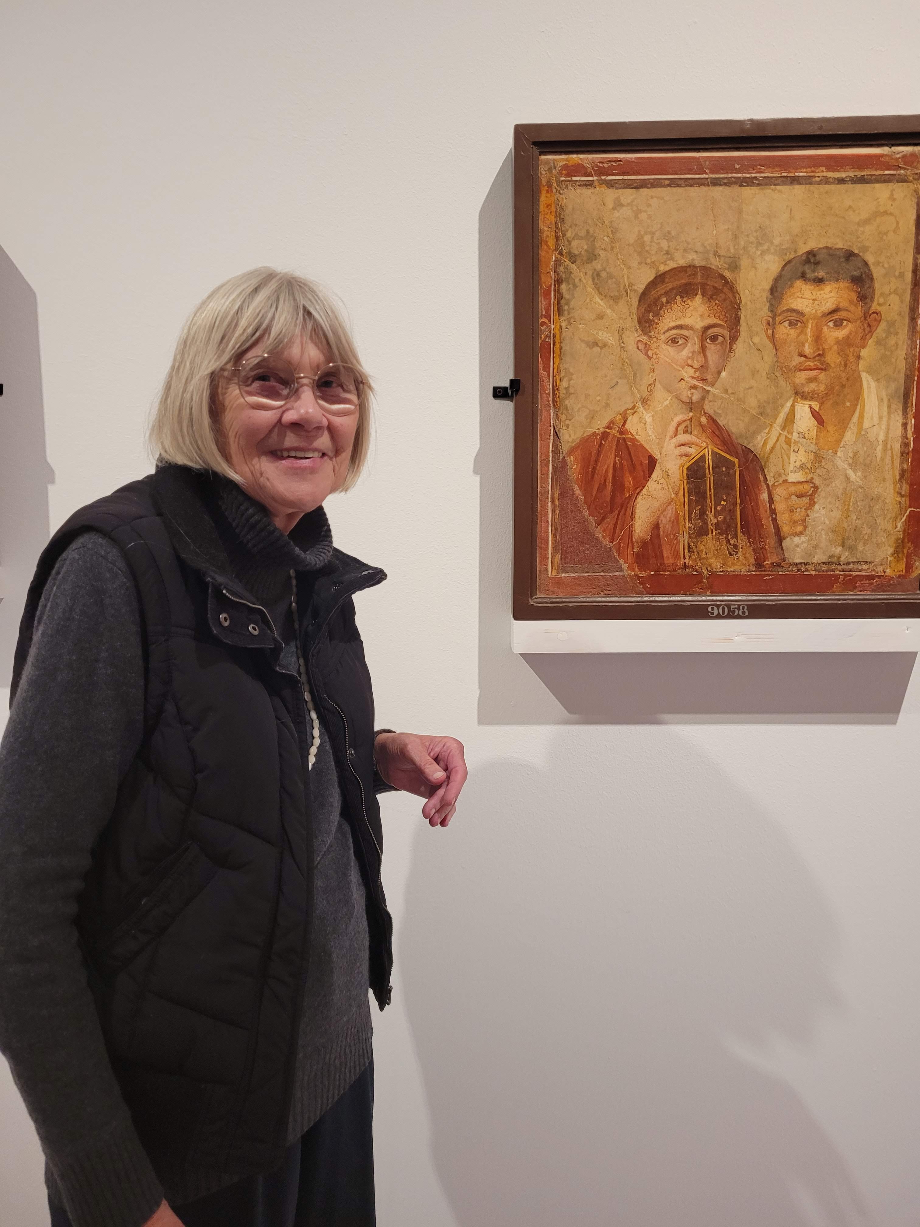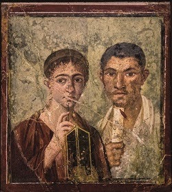Ci-contre: Une fresque d’une boulanger et sa femme, représentés en membres de la classe supérieure (et en égaux!), en toge (lui), et présentant un écritoire et un stylo (elle)