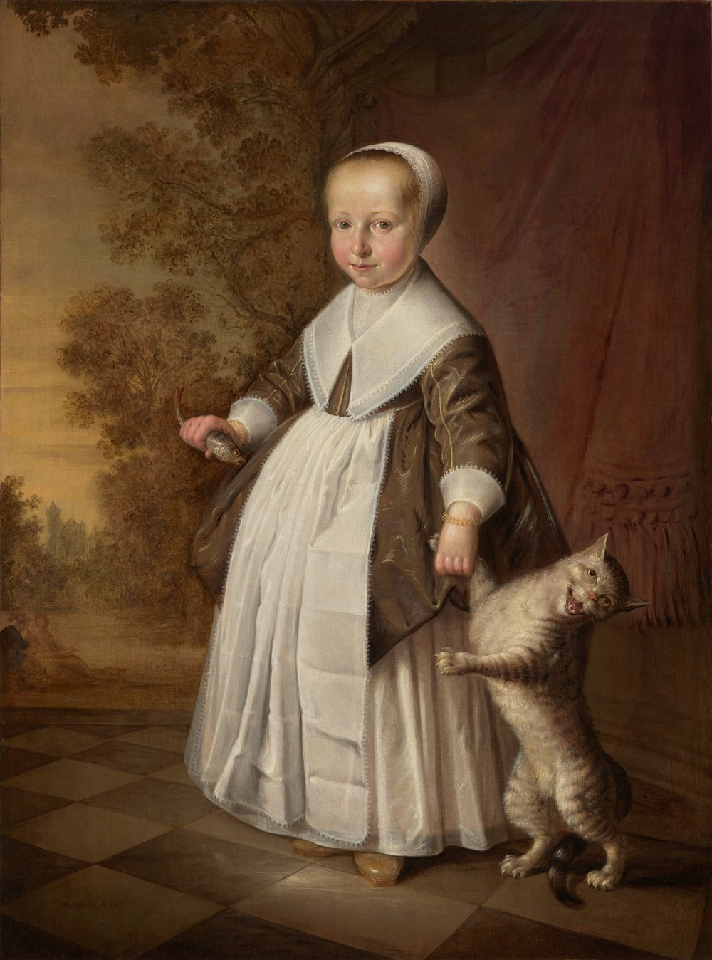 Encore un coup de coeur – et un voyage dans le temps : un tableau de Jacob Cuyp (1594 – 1651, père du paysagiste Albert Cuyp, plus connu). Il est daté de 1647, et représente une petite fille aux joues roses. On lui donnerait le Bon Dieu sans confession, rien que pour son petit sourire espiègle et ses yeux ronds. Mais attention ! À y regarder de près, elle n’est peut-être pas si gentille que ça. De la main gauche, elle traîne un petit chat par une patte. Le petit chat n’est pas content, mais pas du tout du tout. Er d’autant moins que dans la main droite, la petite tient un poisson, qu’elle écarte du chat…. Ah, mais elle est méchante ! Et là, on s’aperçoit que le petit sourire, il est peut-être plus malicieux que gentil….