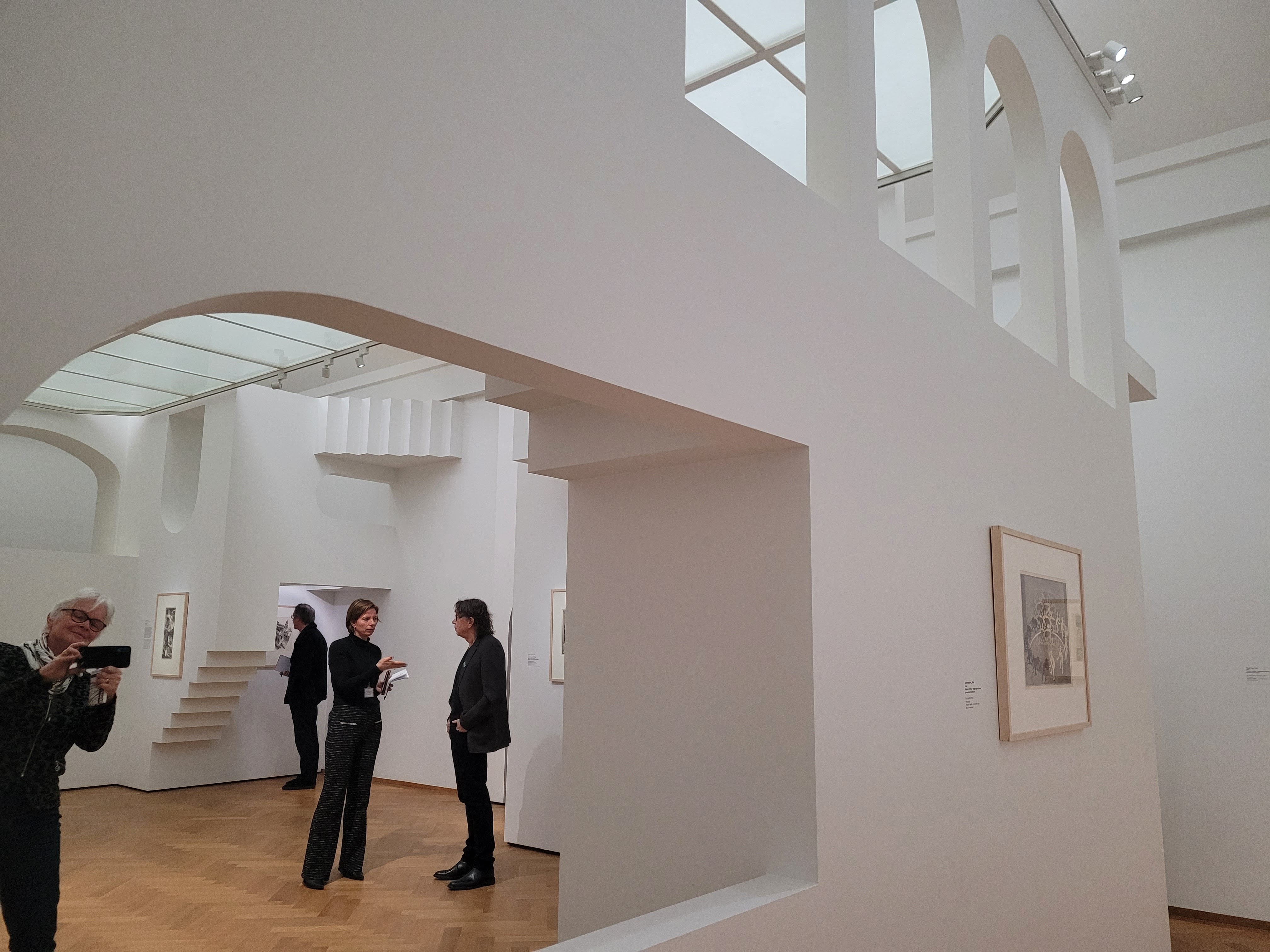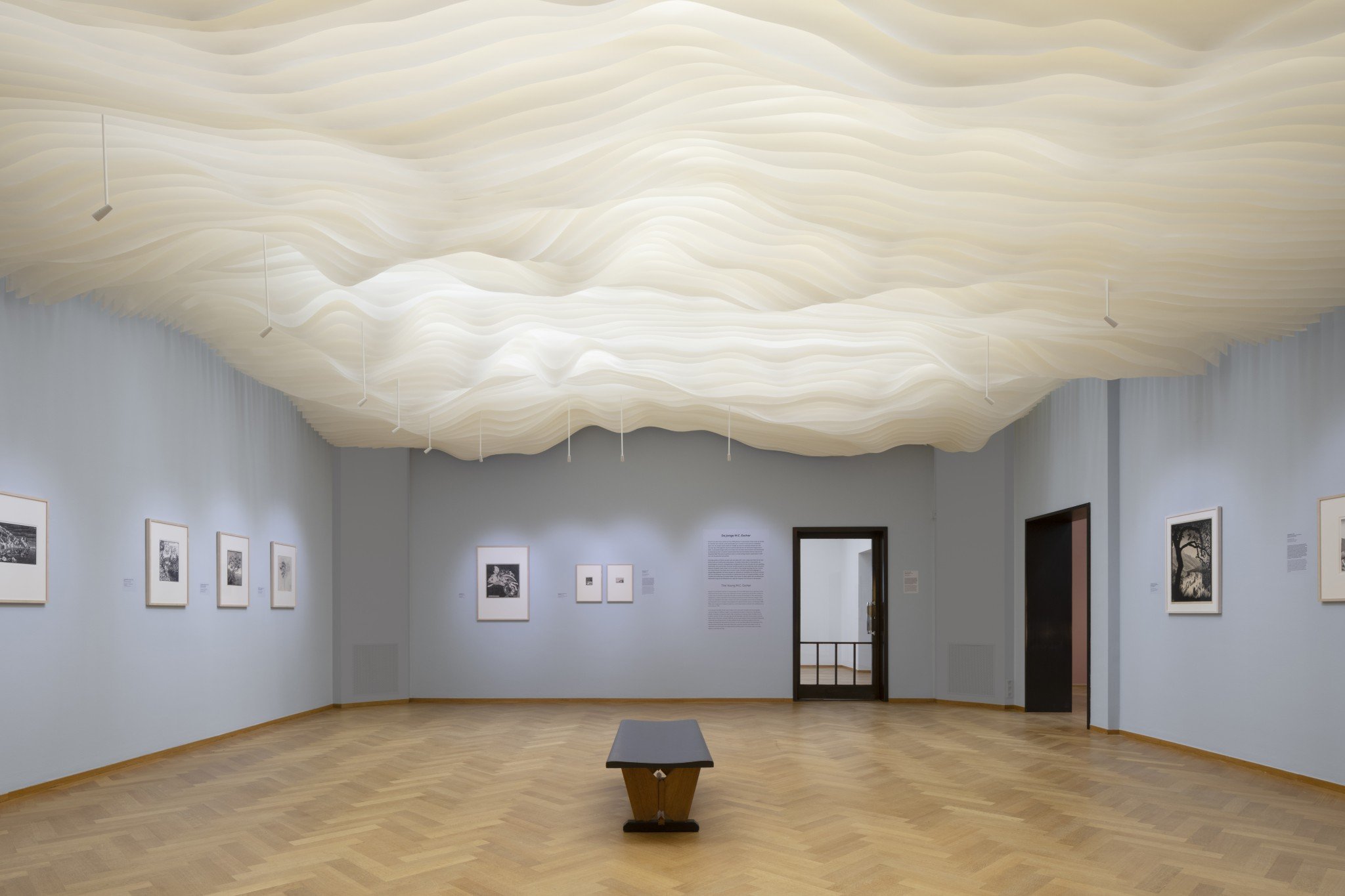 La magie commence dès la première salle, avec un ‘ciel’, des ‘nuages’, un ‘plafond’, de papier ondulé. Les courbes épousent celles des gravures du maître. C’est époustouflant. Et ce n’est qu’un début…