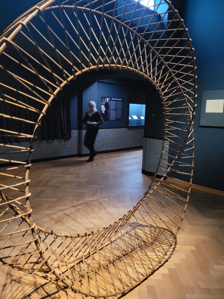 M.C, Escher (1898 – 1972) is, of course, world famous for his black-and-white prints, his dreamed (and,more often than not) archtectural structures, his curved lines that have no beginning and no end, his tessellations (fish changing to birds, bats to butterflies, black to white and white to black), his repetitions ans mirroring, his labyrinths… In this exceptional exhibition in the Kunstmuseum in The Hague, every room is dedicated to one of thes themes. And every theme is accompanied or represented by an extraordinary installation. The room shown here, for instance, is deidcated to the theme infinity. Curved lines that don’t end, and form the ‘infinity’ symbol…