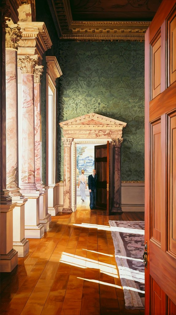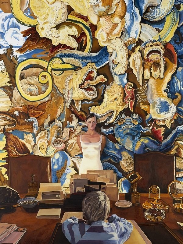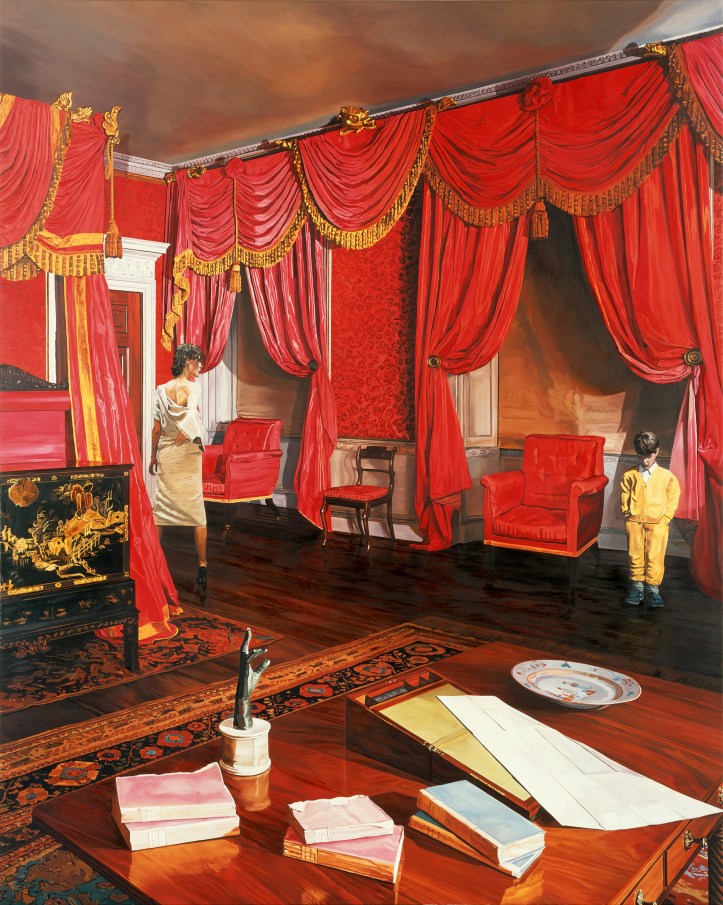What’s in a name? Jan Worst (born 1953) is one of the most interesting contemporary painters I have seen. His canvases are huge, his colors bright, his world strange, not to say unsettling, even uncanny sometimes – although at first glance, you might just see a glamorous world, full of elegant interiors – style landed gentry – with well-filled bookcases, antiques, costly tapestry and carpets, and people looking like they just popped out of a fashion magazine.