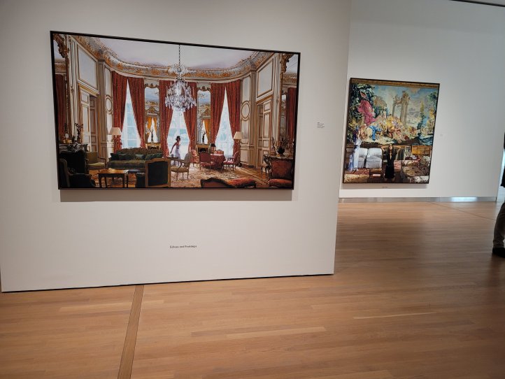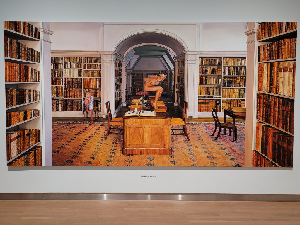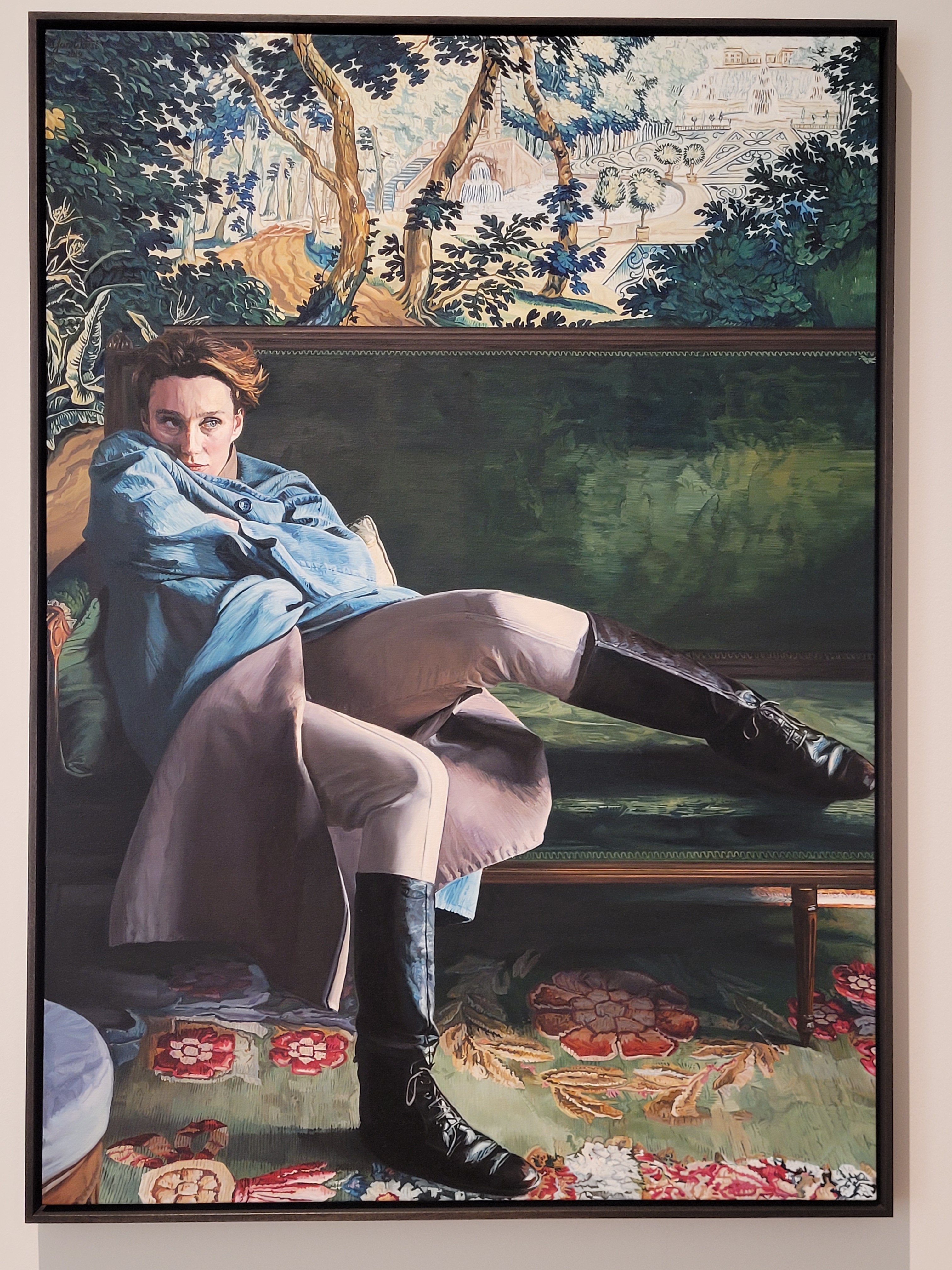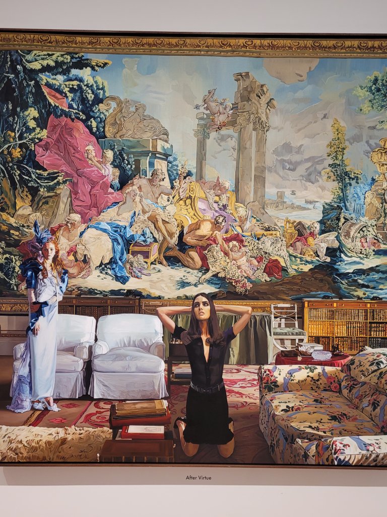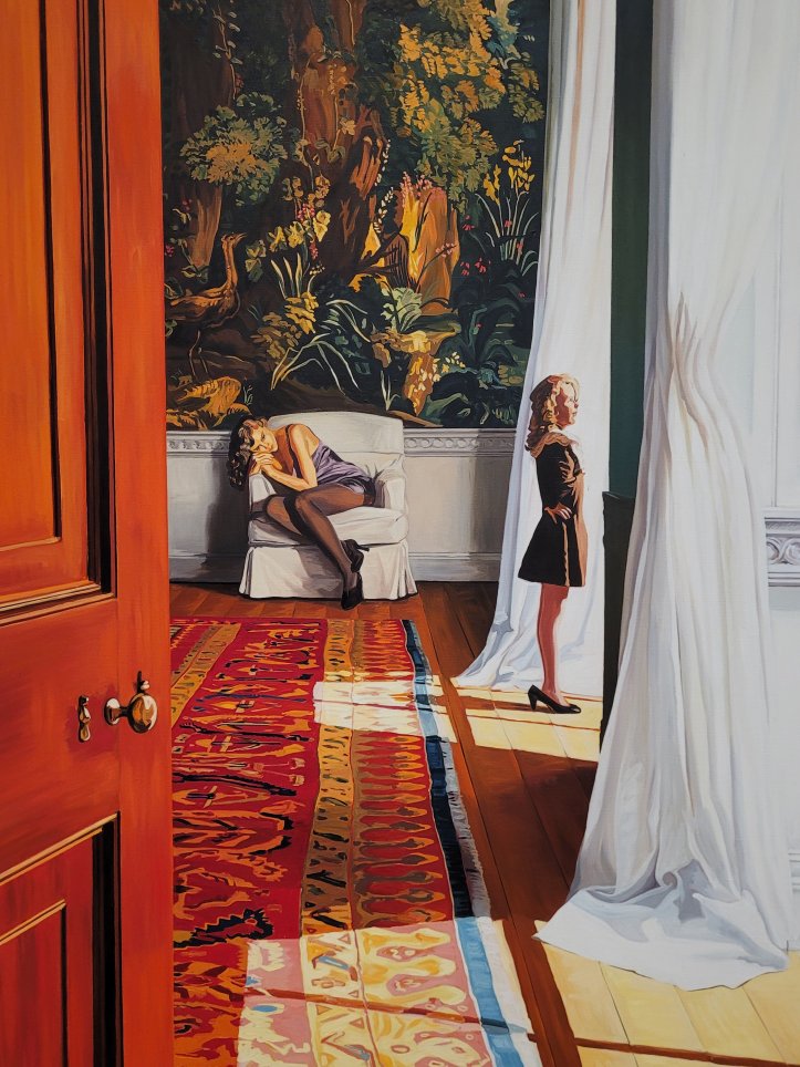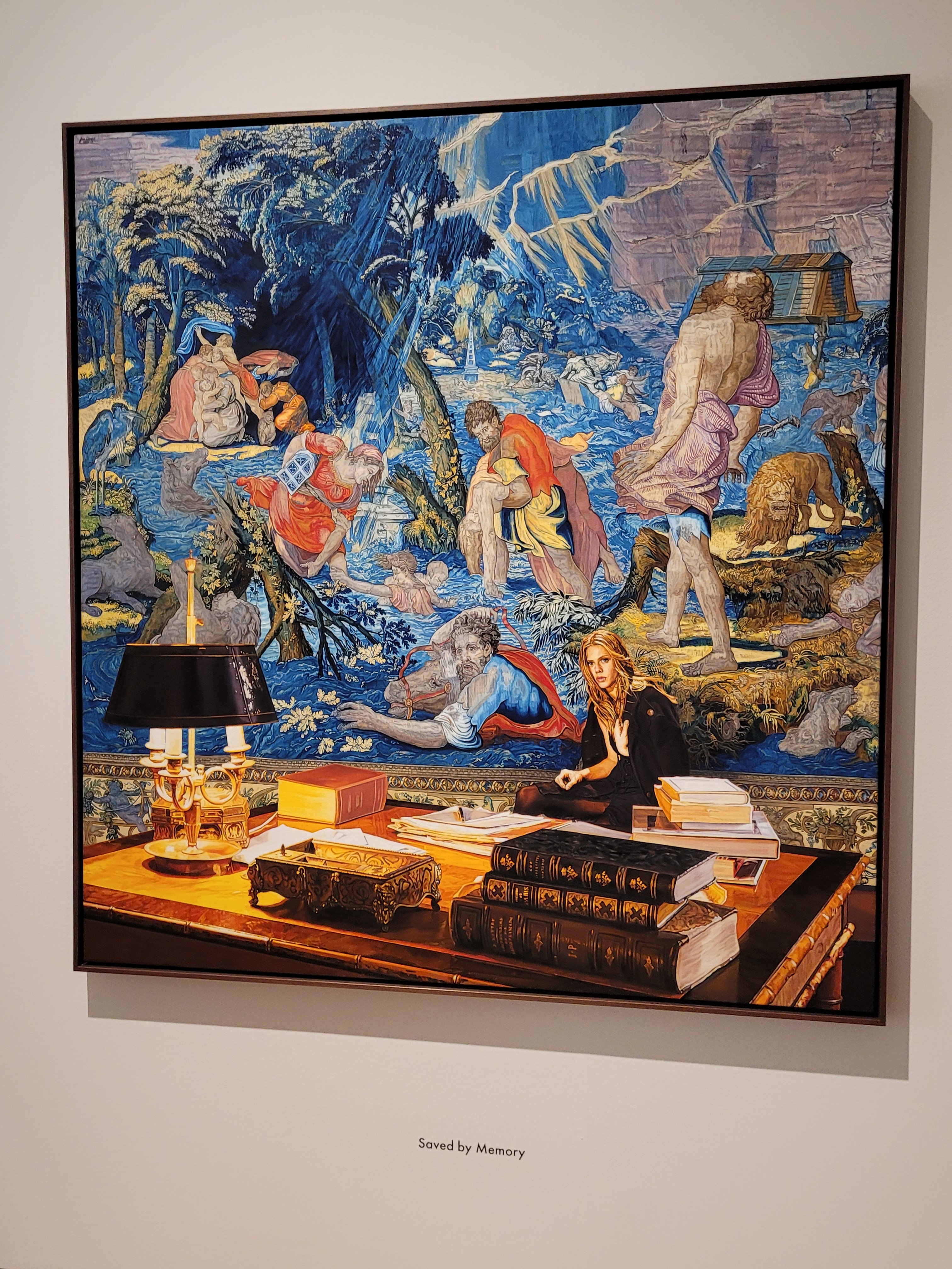 Over the years, the tapestries seem to have come to the foreground. And they tell a story, as much or even more so than the characters in the room – characters who sometimes even seem to be absorbed by the tapestries. Their colors are bright; lots of greenish-blue and bluish-green. This is maybe most obvious in « Saved by Memory » (2022-23, see below), in which the gobelin tells or shows the epic story of Noah and his Ark, with a lot of pathos and a lot of dramatic details. One hardly notices the young woman seated below this tapestry, and the posh desk with its Empire lampshade and the leather-bound books contrasts strangely with the biblical events staged behind.