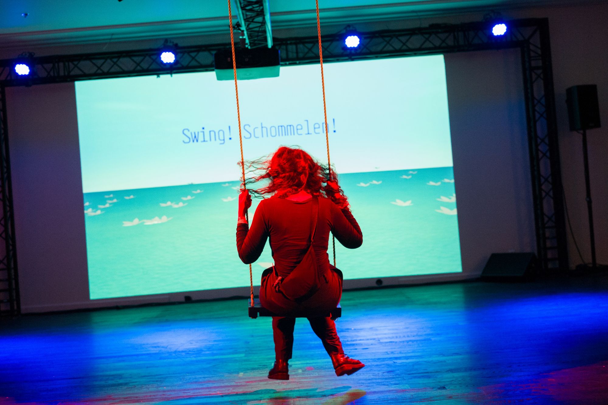 Une jeune femme sur une balançoire. En face d’elle, une vidéo. Des images qui évoquent la Méditerranée, bleutées. alternant avec des images de plats, de maisons, e tapis, reconnaissables pour appartenir à une culture, un pays. Une voix de femme les accompagne, un peu comme si elle récitait un poème, tantôt en arabe, tantôt en français, tantôt en anglais. La voix parle de « home », de nourriture, de choses reconnaissables – ou pas; de danger aussi : d’une mer cimetière, d’un passeport qui ouvrirait des portes au lieu de les fermer, d’une terre accueillante ou peu accueillante ; de visages qui vous dévisagent, de chaleur humaine aussi. La voix – celle de l’artiste, Ines Kooli, née en Tunisie, études en France et aux Pays-Bas – la voix d’Ines, donc, se demande aussi où est son chez soi, là-bas, ici ? On sent les émotions à fleur de peau, émotions contraires, vives. Dépaysement, « second chez-soi » , tout y est.