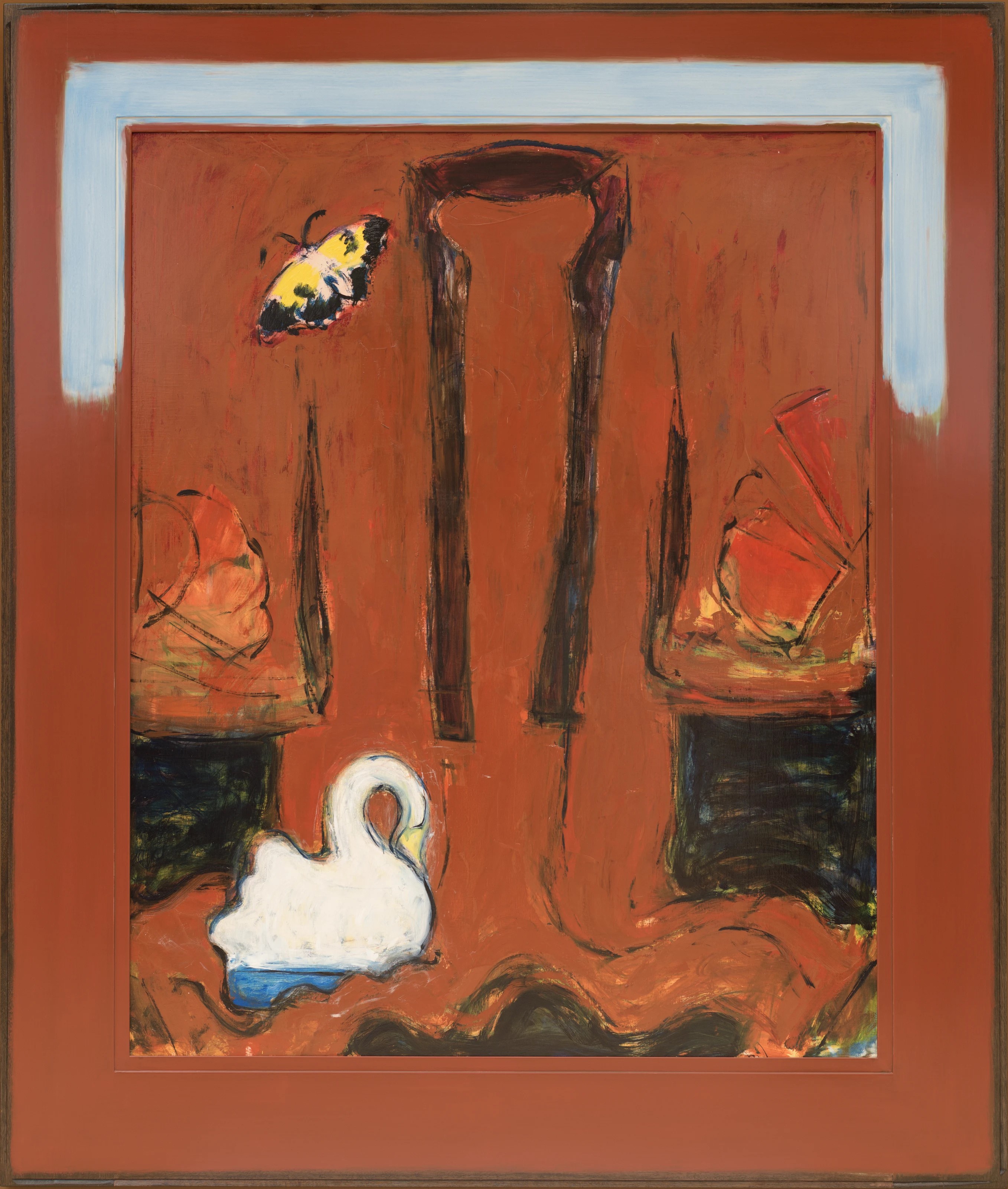 Pour Jory van Rosmalen de la Borzo Gallery, s’il y a une pièce qui lui tient à coeur, c’est bien une grande toile de Hans van Hoek (1947). Elle s’intitule « Kimono au cygne et au papillon » (2017-18) . J’avoue qu’à première vue, j’avais pris la toile pour un panneau de bois, sans doute à cause de l’aspect lisse et brillant de la peinture, et sans doute aussi en partie à cause du remarquable cadre en bois, de la main de l’artiste lui-même. Le tableau fait partie d’une série de « kimonos », (presque) tous dans les mêmes tons rouges-bruns chauds, tous avec des figures (papillons, fleurs, oiseaux… ou indéfinissables) éparpillées à travers le tableau, et tous pourvus d’un cadre extraordinaire.