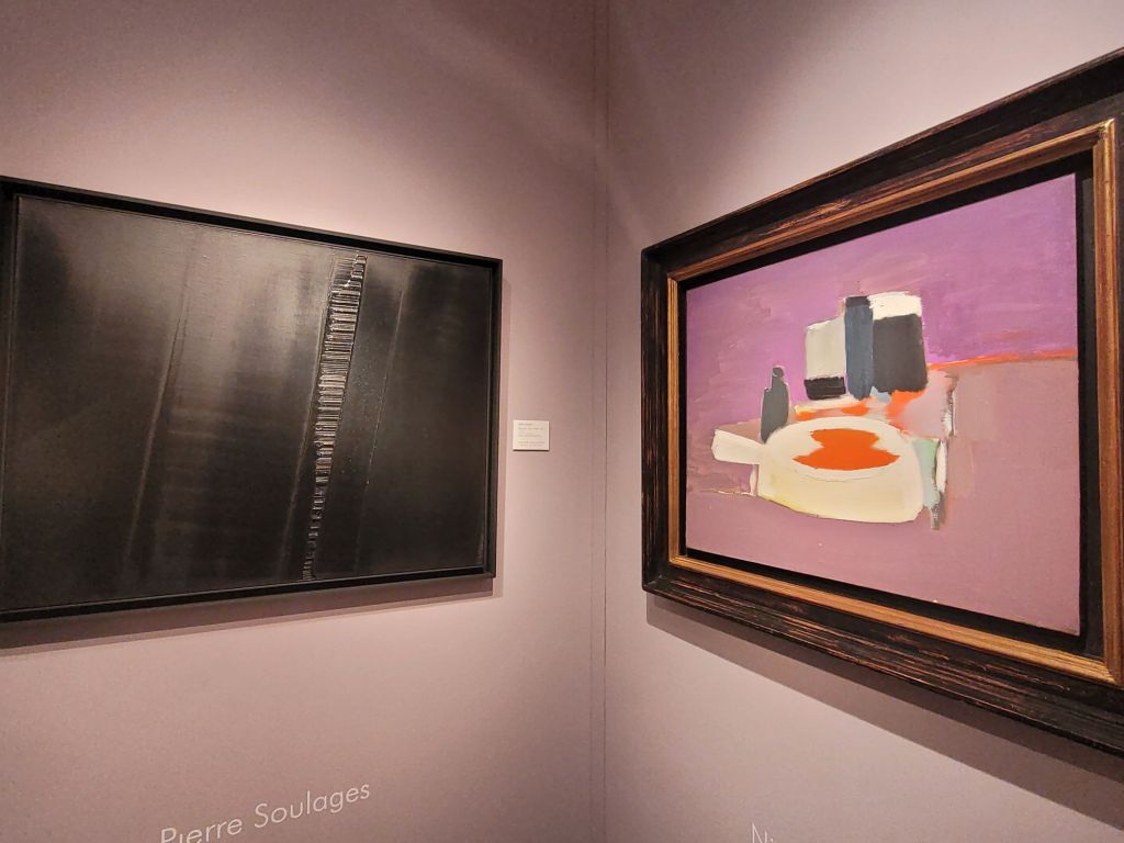 Cette galerie Von Vertes a d’ailleurs d’autres trésors, comme un Braque, un Gerhard Richter, et un superbe Nicolas de Staël (à droite), dont les couleurs semblent rendues encore plus vives par le noir du Soulages à côté…