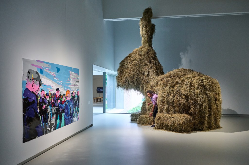 Des oeuvres contemporaines montrent – entre autres – des gens en action. Un tableau de l’artiste Erik van Lieshout met en scène des paysans qui très clairement ne sont pas contents. Une vidéo (2022) de Cynthia Hathaway montre une « Wool-March », une « marche de la laine » : un troupeau de moutons traverse les rues d’un village ou d’une ville, pour protester contre la disparition, dans l’usage quotidien, d’un excellent produit comme la laine, au profit de fils synthétiques. C’est vrai, se dit-on en voyant ces images, et c’est complètement idiot. Pourquoi donc cette évolution ? Et peut-on la retourner ?