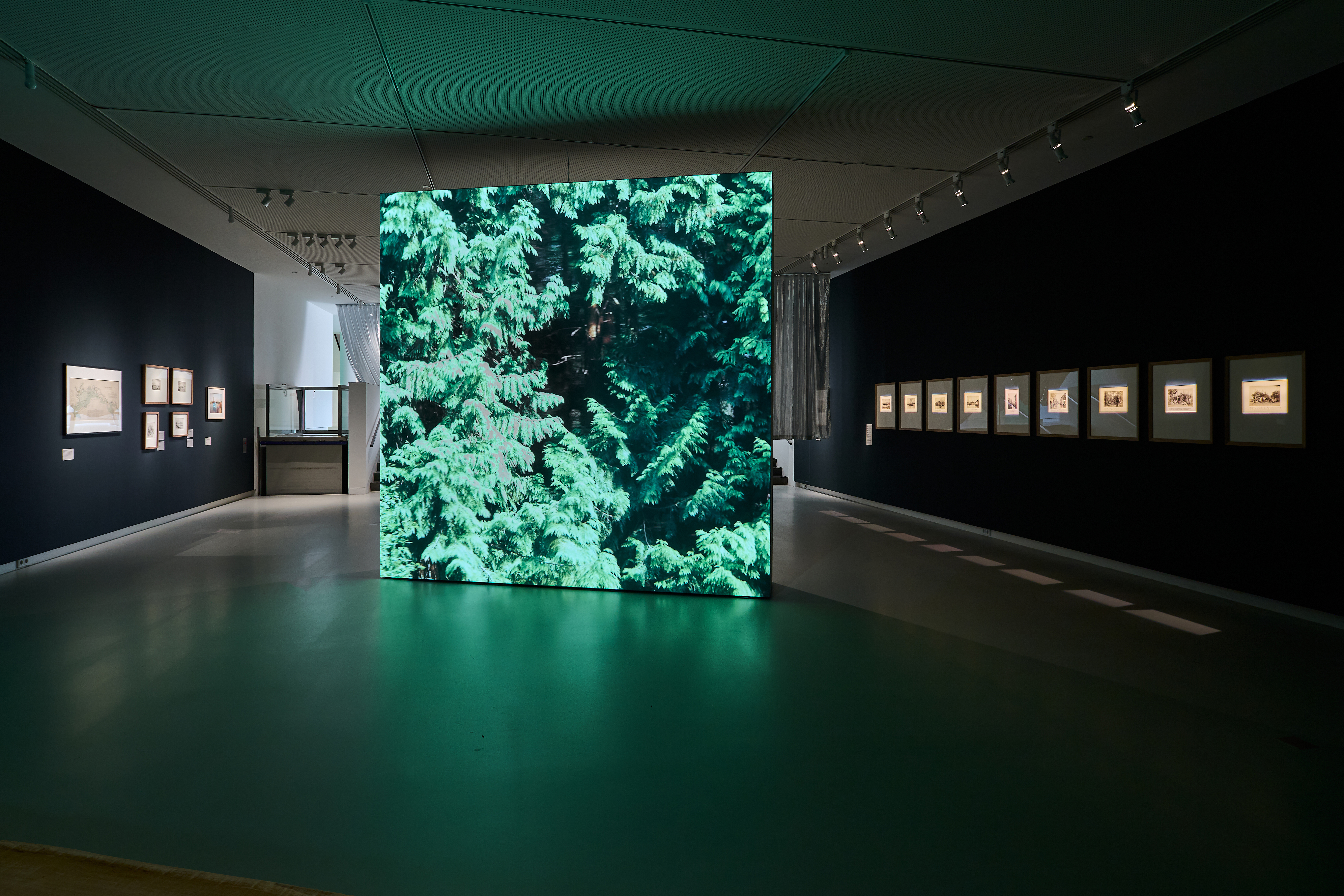 Petit à petit, on voit ce paysage changer, avec l’industrialisation qui s’intensifie au fur et à mesure. Et, en alternance avec ce qui paraît encore assez idyllique, des vidéo de catastrophes « naturelles », un feu de forêt, un film sur Bambi dans une version – basée sur le livre original – qui se termine mal, un paysage apocalyptique. Les rideaux séparant les (parties de) salles changent de matière, deviennent synthétiques, comme ceux qui entourent des échafaudages, par exemple. Petit à petit aussi, les photos remplacent les peintures.