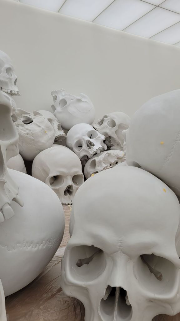 Ces crânes, tous identiques, à quelques dents près, forment une sorte de paysage, minutieusement mis en scène par l’artiste. Chacun des crânes pèse 40 kilos. Créés pour le National Gallery of Victoria (Melbourne, Australie), et arrivés en Europe en 2023 pour une première exposition à la Fondation Cartier.