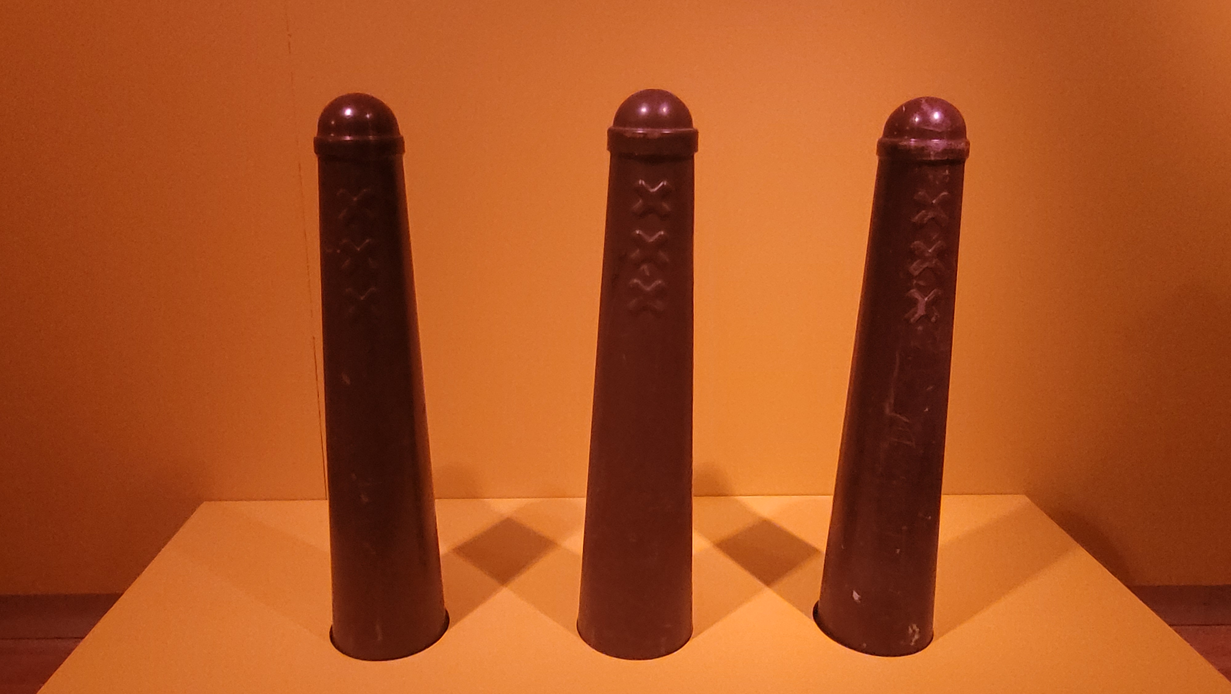 La grande salle de l’exposition est divisée en compartiments par trois grandes croix de Saint-André, qui -surmontées de deux lions et de la couronne impériale de Maximilien, premier empereur du Saint-Empire – font partie des armoiries de la ville. Il y a plusieurs légendes concernant ces croix. La plus courante les interprète comme les symboles de trois plaies qui ont frappé la ville : des inondations, des incendies et la peste. On retrouve cette symbolique dans les couleurs de la ville : le rouge pour le feu, le blanc pour l’eau, et le noir pour la peste.