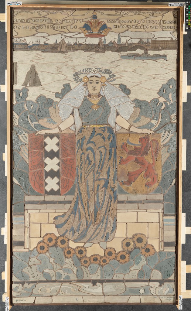Amsterdam’s ‘City Virgin’, resting her hands on (parts of) the armouries of the city ; left, the three Saint-Andreas crosses, supposedly symbolising the three plagues that struck Amsterdam, fires, inundations, and the Black Death, symbolised also by the colours red, white and black. The lion, on the right side, is normally shown as part of a couple of lions holding up a large crown – donated to the city by emperor Maximilian.