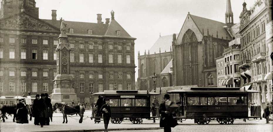 La Place du Dam, avec le Palais Royal au fond, et l’Église Neuve (à droite), photographié par le peintre George Hendrik Breitner dans les années 1890. La statue n’existe plus. Le tramway à chevaux non plus, de toute évidence…