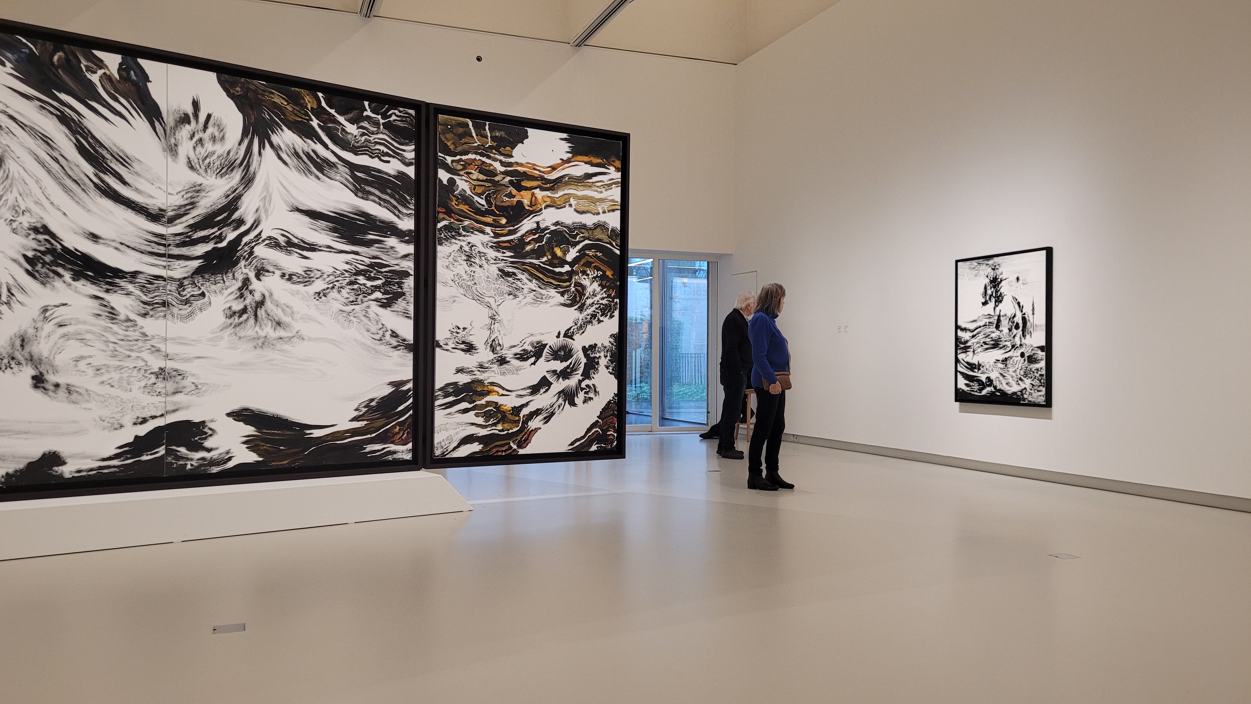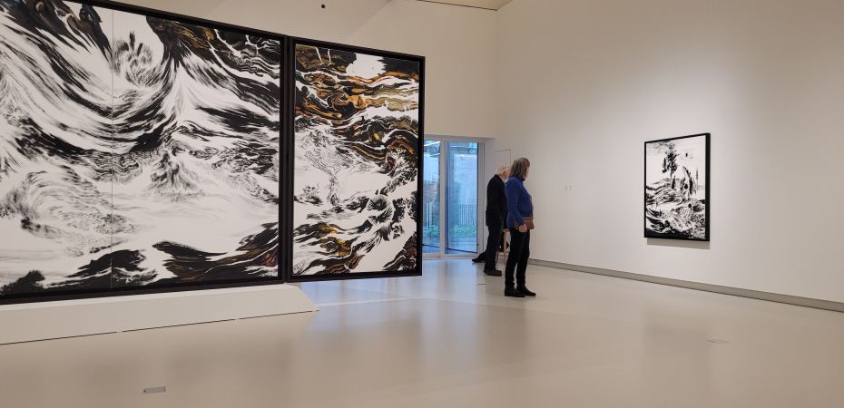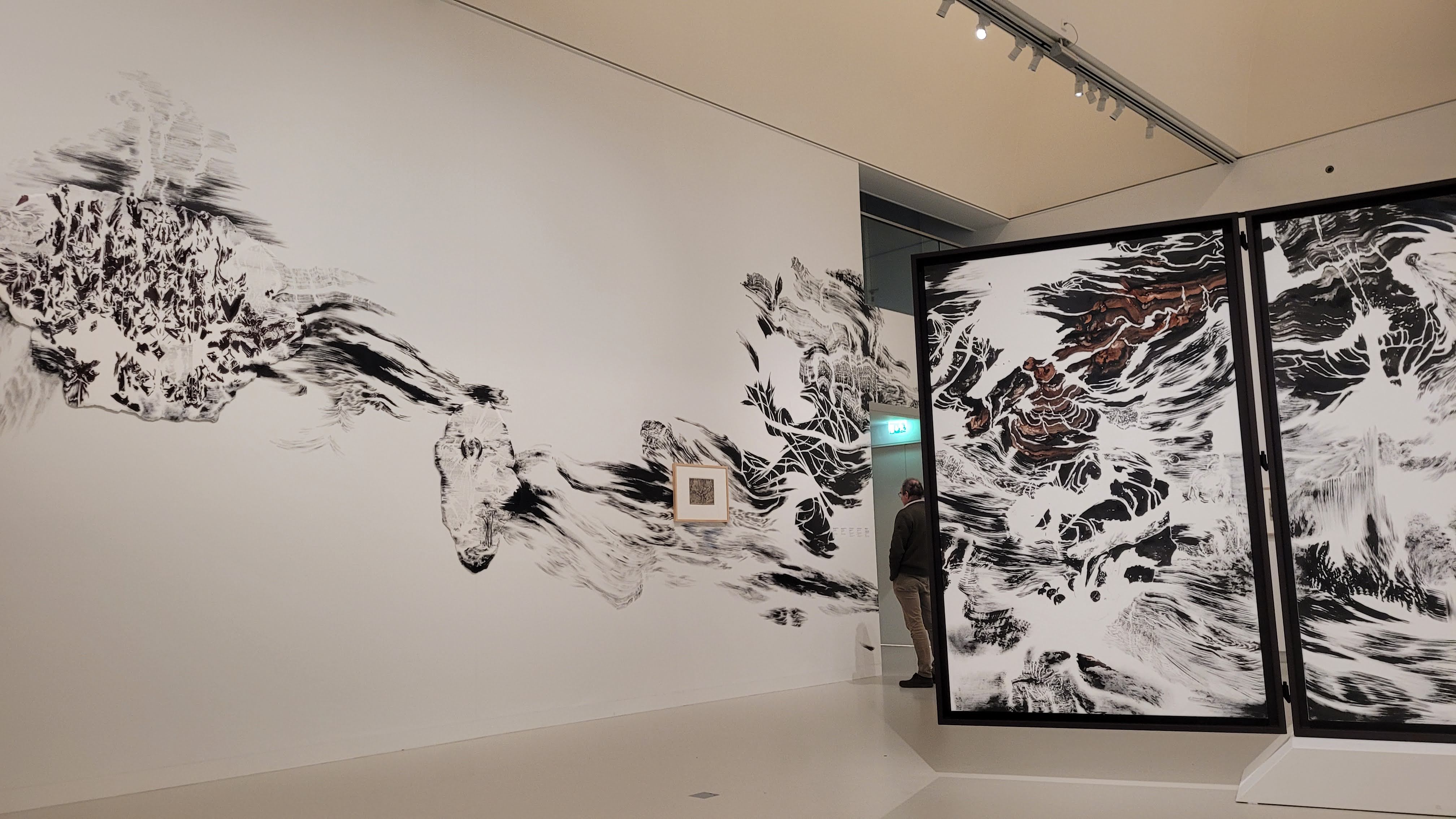 En face,  un grand triptyque couvert de traits ondulants, arqués, soulignés par des hachures. Ça et là, on croit reconnaître des collines, des montagnes, des arbres, des nuages peut-être. Ou des vagues. C’est un paysage, nul doute. Le trait rappelle vaguement celui des estampes japonaises, ou chinoises. Que du noir et blanc – à première vue. À deuxième vue, on distingue des traits de couleur, et plus on regarde, plus on en découvre.