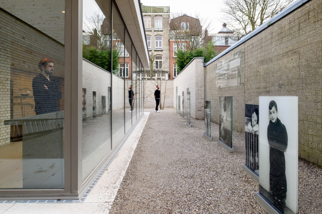 Still, we didn’t have a national monument for the victims of the Shoah, as opposed to, for instance, France, where the names of all the victims are visible in an impressive shrine in Paris. In 2021, seventy-six years after the end of the Second World War, at long last, King Willem Alexander inaugurated this impressive « wall » showing the 102.000 names of the Jewish victims, and the 220 Roma or Sinti who were killed by the nazis (picture at the top). This Memorial, like the statue of the Docker – in remembrance of the only strike against the deportation of Jews – is in the old Jewish area, where several monuments and museums remind us of the past. The Docker faces the Jewish Museum, and turns his back to the old Portuguese Synagogue. Nearby, on the Plantage Middenlaan, the former « Dutch Theatre » (Hollandsche Schouwburg) – where during the war the Jewish inhabitants of Amsterdam were assembled in view of their deportation, has been turned into an impressive monument. Just across the street, the latest « corner stone » of this area where the past is so present : the Holocaust museum, on the very spot of a former teachers training college, where very brave people helped their neighbours from the nursery next doors to rescue as many children as they could…
